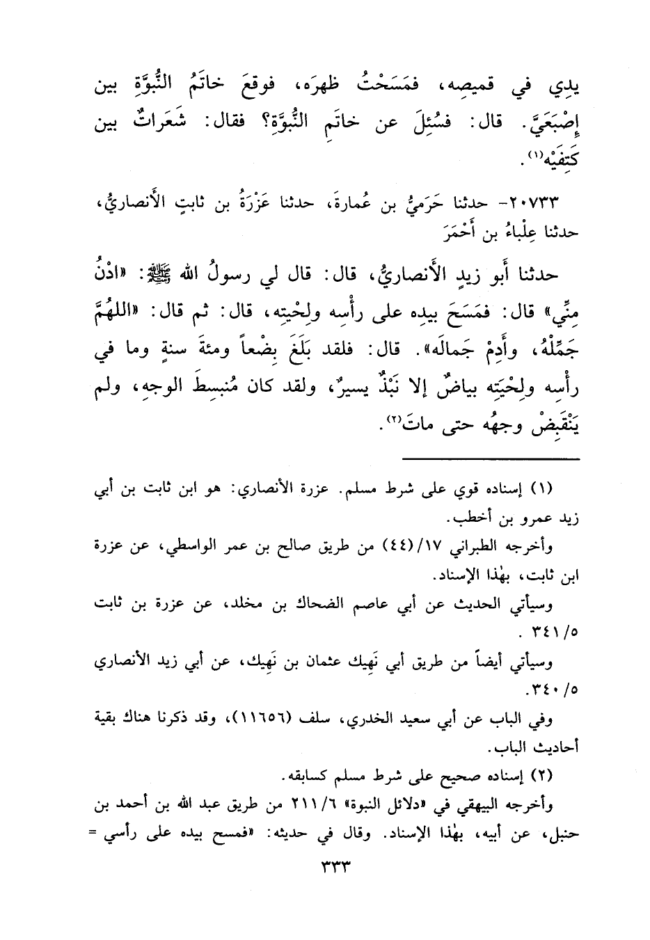 ٢٠٧٣٣ - حَدَّثَنَا حَرَمِيُّ بْنُ عُمَارَةَ، حَدَّثَنَا عَزْرَةُ بْنُ ثَابِتٍ الْأَنْصَارِيُّ، حَدَّثَنَا عِلْبَاءُ بْنُ أَحْمَرَ، حَدَّثَنَا أَبُو زَيْدٍ الْأَنْصَارِيُّ، قَالَ: قَالَ لِي رَسُولُ اللهِ صَلَّى اللهُ عَلَيْهِ وَسَلَّمَ: " ادْنُ مِنِّي "، قَالَ: فَمَسَحَ بِيَدِهِ عَلَى رَأْسِهِ، وَلِحْيَتِهِ، قَالَ: ثُمَّ قَالَ: " اللهُمَّ جَمِّلْهُ، وَأَدِمْ جَمَالَهُ "، قَالَ: " فَلَقَدْ بَلَغَ بِضْعًا، وَمِائَةَ سَنَةٍ وَمَا فِي رَأْسِهِ وَلِحْيَتِهِ بَيَاضٌ، إِلَّا نَبْذٌ يَسِيرٌ، وَلَقَدْ كَانَ مُنْبَسِطَ الْوَجْهِ، وَلَمْ يَنْقَبِضْ وَجْهُهُ حَتَّى مَاتَ " (٢)
