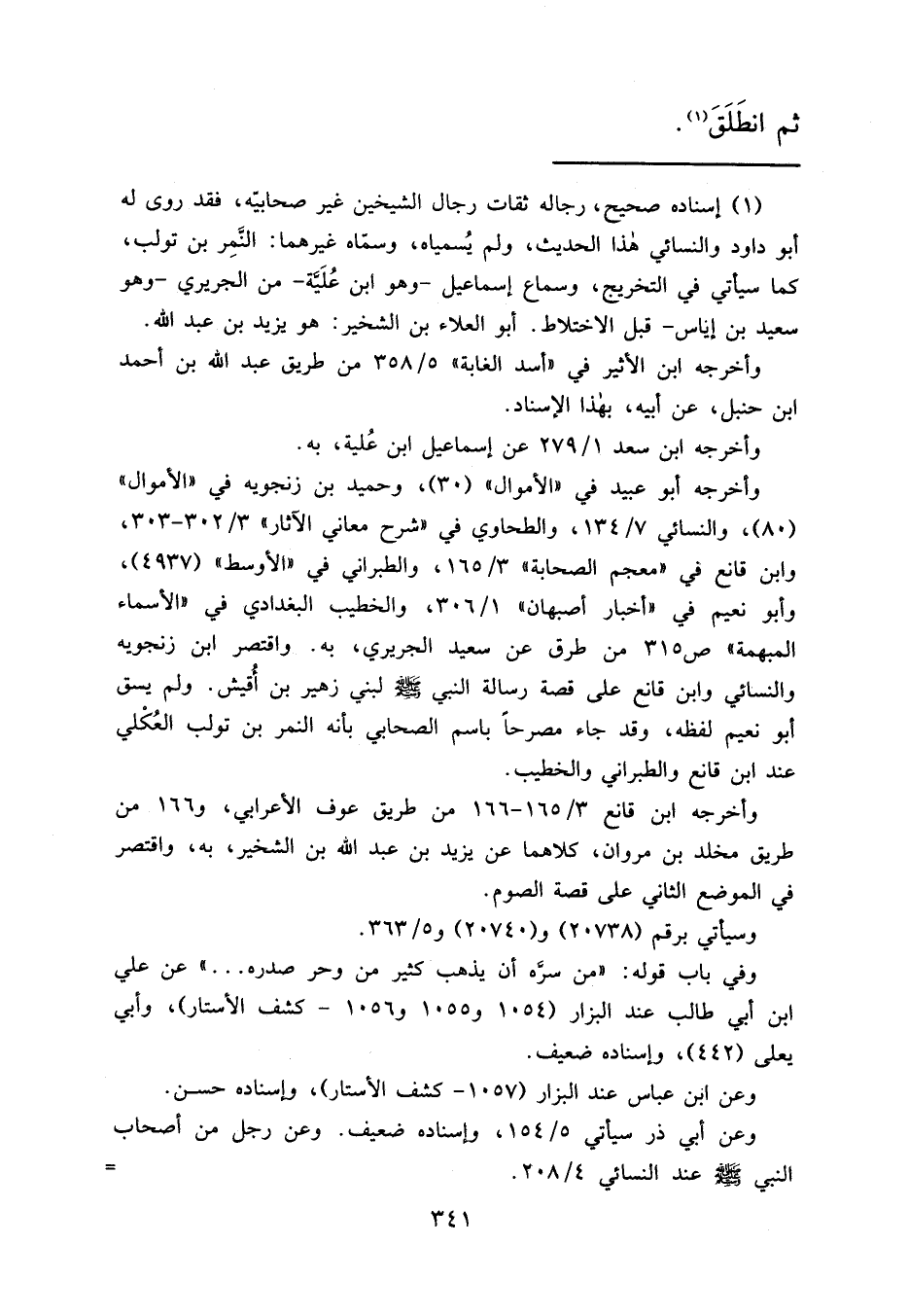 وأخرجه أبو عبيد في "الأموال" (٣٠) ، وحميد بن زنجويه في "الأموال" (٨٠) ، والنسائي ٧/١٣٤، والطحاوي في "شرح معاني الآثار" ٣/٣٠٢-٣٠٣، وابن قانع في "معجم الصحابة" ٣/١٦٥، والطبراني في "الأوسط" (٤٩٣٧) ، وأبو نعيم في "أخبار أصبهان" ١/٣٠٦، والخطيب البغدادي في "الأسماء المبهمة" ص ٣١٥ من طرق عن سعيد الجريري، به. واقتصر ابن زنجويه والنسائي وابن قانع على قصة رسالة النبي صَلَّى اللهُ عَلَيْهِ وَسَلَّمَ لبنى زهير بن أُقيش. ولم يسق أبو نعيم لفظه، وقد جاء مصرحاً باسم الصحابي بأنه النمر بن تولب العُكْلي عند ابن قانع والطبراني والخطيب.