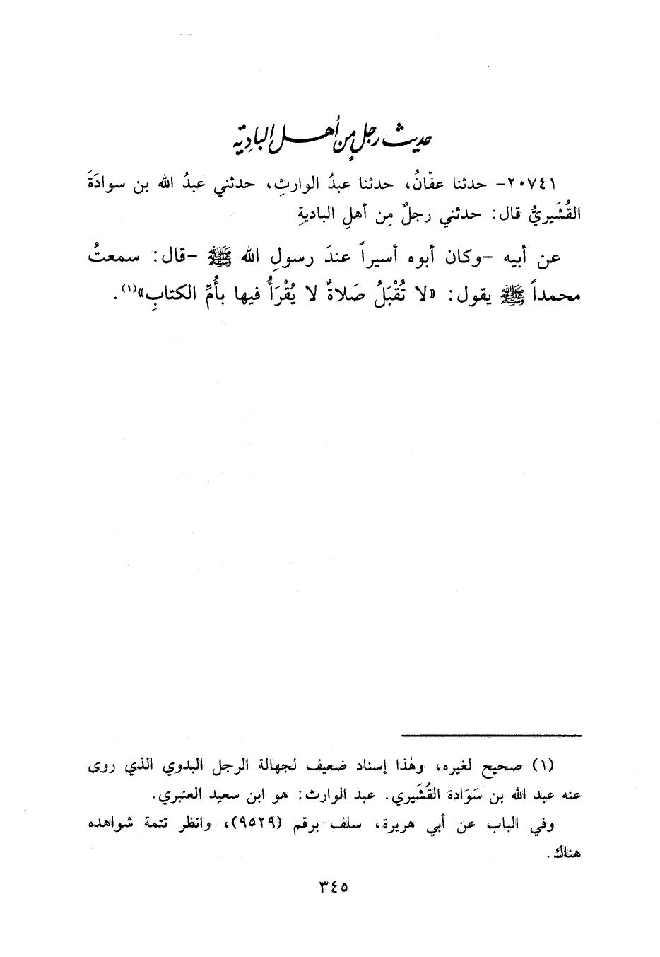 ٢٠٧٤١ - حَدَّثَنَا عَفَّانُ، حَدَّثَنَا عَبْدُ الْوَارِثِ، حَدَّثَنِي عَبْدُ اللهِ بْنُ سَوَادَةَ الْقُشَيْرِيُّ، قَالَ: حَدَّثَنِي رَجُلٌ مِنْ أَهْلِ الْبَادِيَةِ، عَنْ أَبِيهِ وَكَانَ أَبُوهُ أَسِيرًا عِنْدَ رَسُولِ اللهِ صَلَّى اللهُ عَلَيْهِ وَسَلَّمَ، قَالَ: سَمِعْتُ مُحَمَّدًا صَلَّى اللهُ عَلَيْهِ وَسَلَّمَ يَقُولُ: " لَا تُقْبَلُ صَلَاةٌ لَا يُقْرَأُ فِيهَا بِأُمِّ الْكِتَابِ " (١)