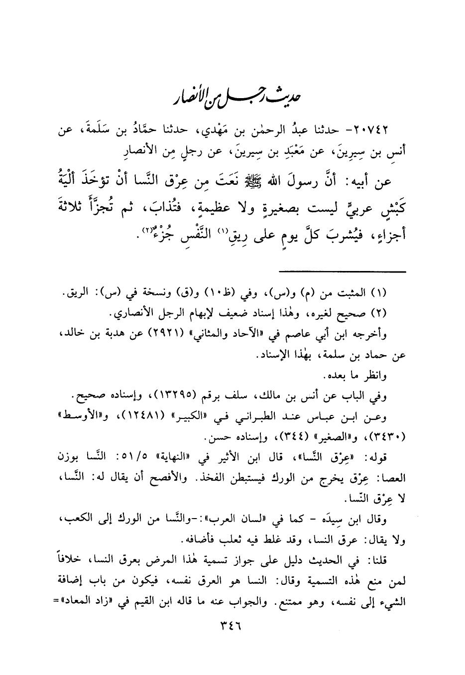 ٢٠٧٤٢ - حَدَّثَنَا عَبْدُ الرَّحْمَنِ بْنُ مَهْدِيٍّ، حَدَّثَنَا حَمَّادُ بْنُ سَلَمَةَ، عَنْ أَنَسِ بْنِ سِيرِينَ، عَنْ مَعْبَدِ بْنِ سِيرِينَ، عَنْ رَجُلٍ مِنَ الْأَنْصَارِ، عَنْ أَبِيهِ، " أَنَّ رَسُولَ اللهِ صَلَّى اللهُ عَلَيْهِ وَسَلَّمَ: نَعَتَ مِنْ عِرْقِ النَّسَا، أَنْ تُؤْخَذَ أَلْيَةُ كَبْشٍ عَرَبِيٍّ، لَيْسَتْ بِصَغِيرَةٍ، وَلَا عَظِيمَةٍ، فَتُذَابَ ثُمَّ تُجَزَّأَ ثَلَاثَةَ أَجْزَاءٍ، فَيُشْرَبَ كُلَّ يَوْمٍ عَلَى رِيقِ (١) النَّفَسِ جُزْءً " (٢)