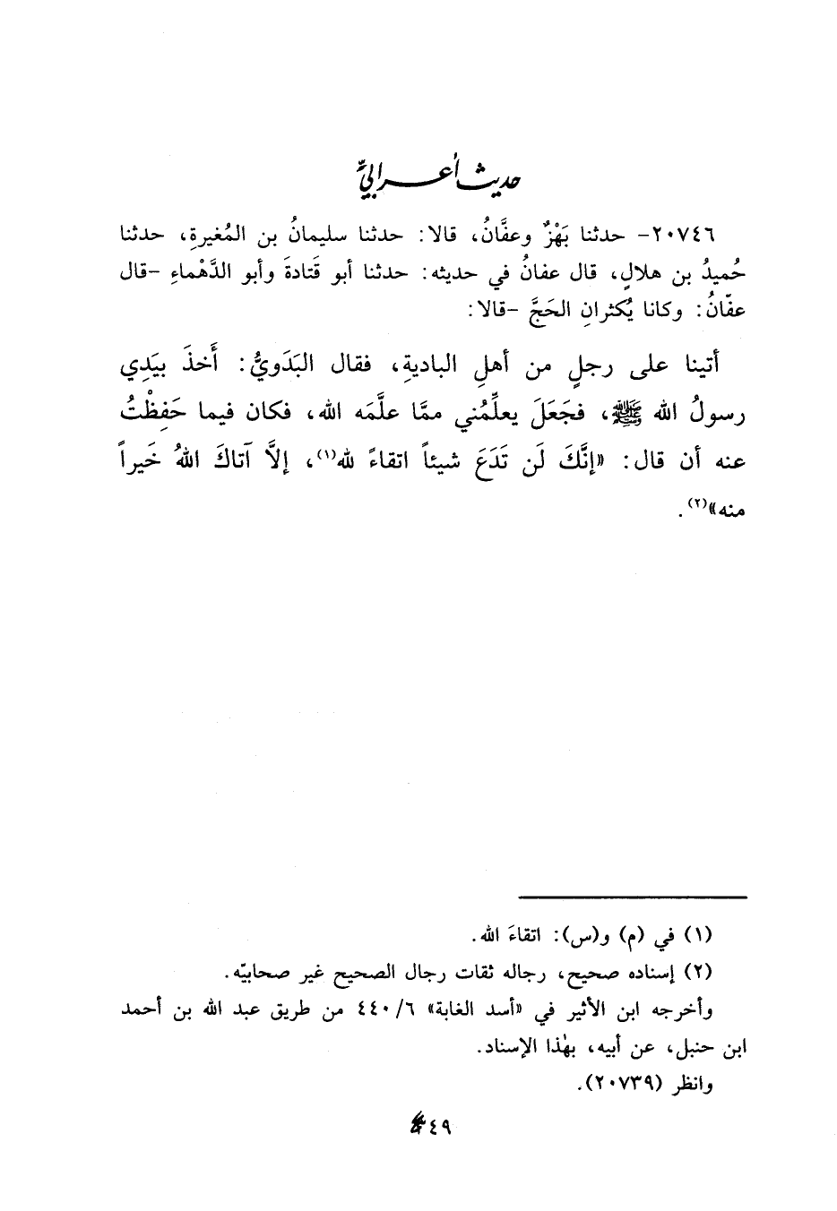 ٢٠٧٤٦ - حَدَّثَنَا بَهْزٌ، وَعَفَّانُ، قَالَا: حَدَّثَنَا سُلَيْمَانُ بْنُ الْمُغِيرَةِ، حَدَّثَنَا حُمَيْدُ بْنُ هِلَالٍ، قَالَ عَفَّانُ فِي حَدِيثِهِ: حَدَّثَنَا أَبُو قَتَادَةَ، وَأَبُو الْدَّهْمَاءِ، قَالَ عَفَّانُ: وَكَانَا يُكْثِرَانِ الْحَجَّ، قَالَا: أَتَيْنَا عَلَى رَجُلٍ مِنْ أَهْلِ الْبَادِيَةِ، فَقَالَ الْبَدَوِيُّ: أَخَذَ بِيَدِي رَسُولُ اللهِ صَلَّى اللهُ عَلَيْهِ وَسَلَّمَ، فَجَعَلَ يُعَلِّمُنِي مِمَّا عَلَّمَهُ اللهُ، فَكَانَ فِيمَا حَفِظْتُ عَنْهُ أَنْ قَالَ: " إِنَّكَ لَنْ تَدَعَ شَيْئًا اتِّقَاءً لِلَّهِ، (١) إِلَّا آتَاكَ اللهُ خَيْرًا مِنْهُ " (٢)