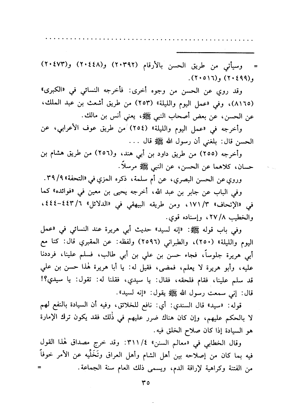 وفي باب قوله صَلَّى اللهُ عَلَيْهِ وَسَلَّمَ: "إنه لسيد" حديث أبي هريرة عند النسائي في "عمل اليوم والليلة" (٢٥٠) ، والطبراني (٢٥٩٦) ولفظه: عن المقبري قال: كنا مع أبي هريرة جلوساً، فجاء حسن بن علي بن أبي طالب، فسلم علينا، فرددنا عليه، وأبو هريرة لا يعلم، فمضى، فقيل له: يا أبا هريرة هذا حسن بن علي قد سلم علينا، فقام فلحقه، فقال: يا سيدي، فقلنا له: تقول: يا سيدي؟!