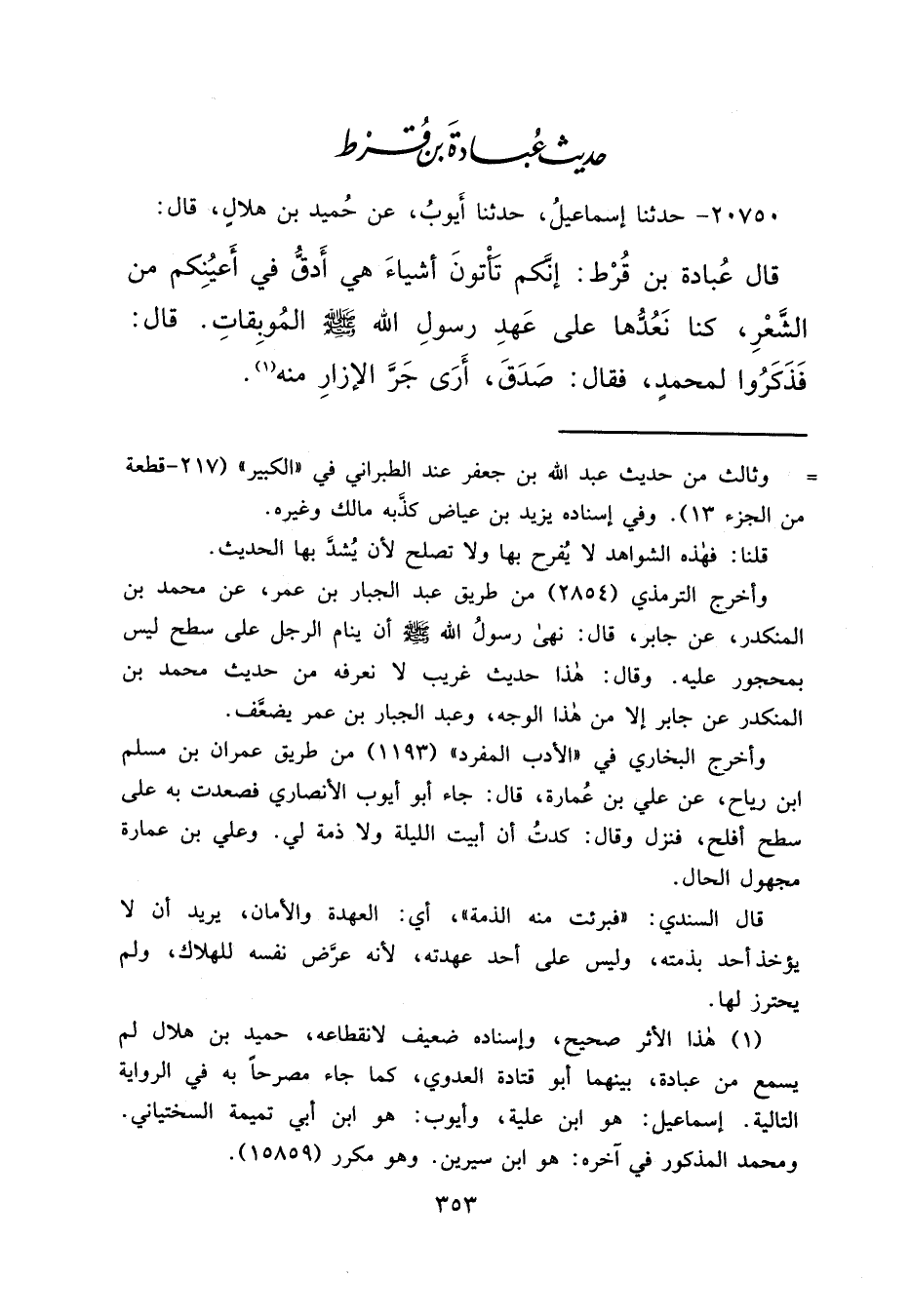 ٢٠٧٥٠ - حَدَّثَنَا إِسْمَاعِيلُ، حَدَّثَنَا أَيُّوبُ، عَنْ حُمَيْدِ بْنِ هِلَالٍ، قَالَ: قَالَ عُبَادَةُ بْنُ قُرْطٍ: " إِنَّكُمْ تَأْتُونَ أَشْيَاءَ هِيَ أَدَقُّ فِي أَعْيُنِكُمْ مِنَ الشَّعْرِ، كُنَّا نَعُدُّهَا عَلَى عَهْدِ رَسُولِ اللهِ صَلَّى اللهُ عَلَيْهِ وَسَلَّمَ، الْمُوبِقَاتِ " قَالَ: فَذَكَرُوا ذَلِكَ لِمُحَمَّدٍ، فَقَالَ: " صَدَقَ، أَرَى جَرَّ الْإِزَارِ مِنْهُ " (١)