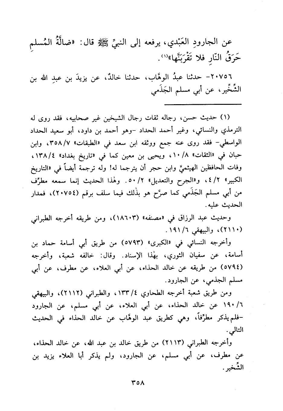 عَنِ الْجَارُودِ الْعَبْدِيِّ، يَرْفَعُهُ إِلَى النَّبِيِّ صَلَّى اللهُ عَلَيْهِ وَسَلَّمَ قَالَ: " ضَالَّةُ الْمُسْلِمِ حَرَقُ النَّارِ، فَلَا تَقْرَبَنَّهَا " (١)