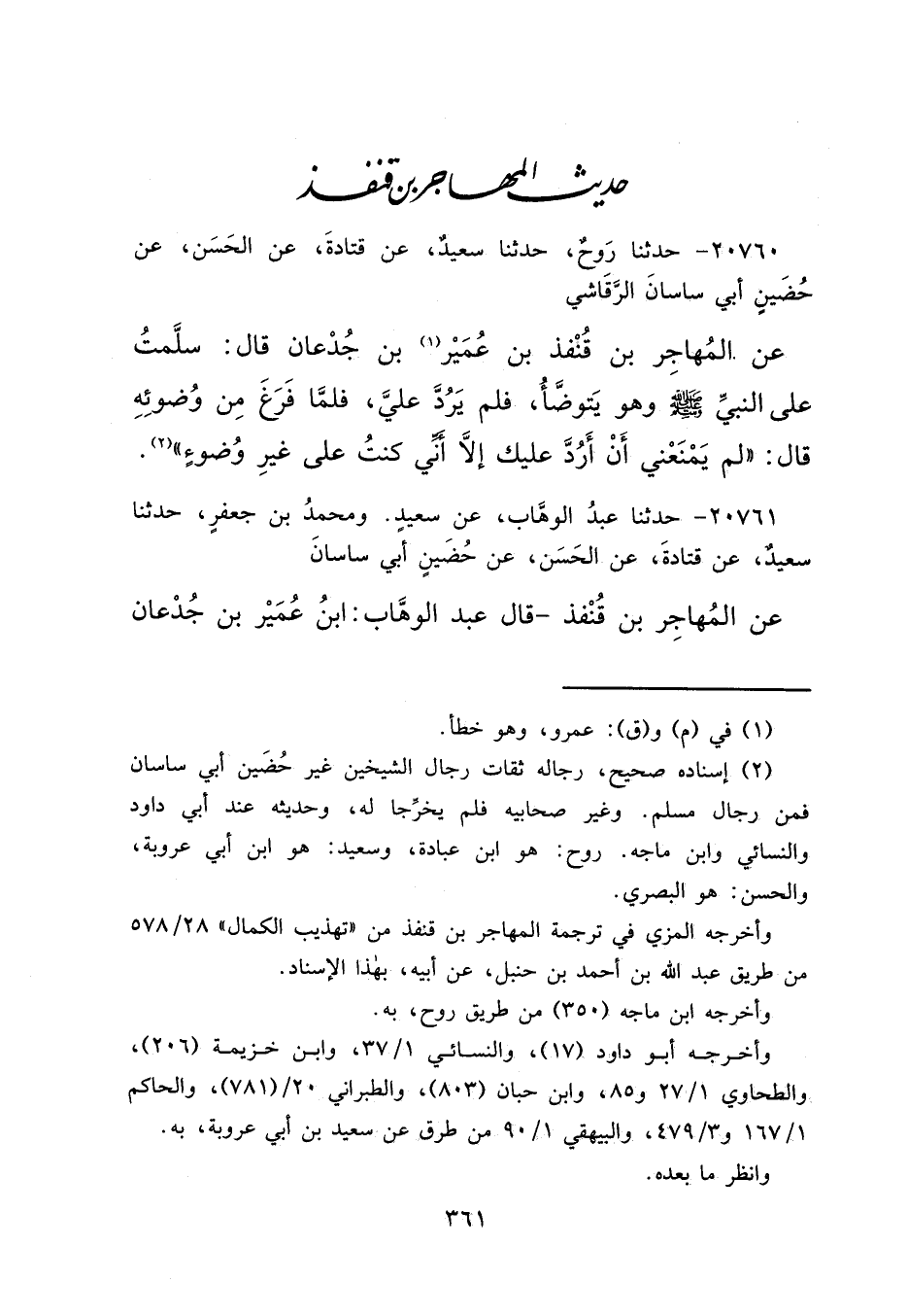 ٢٠٧٦٠ - حَدَّثَنَا رَوْحٌ، حَدَّثَنَا سَعِيدٌ، عَنْ قَتَادَةَ، عَنِ الْحَسَنِ، عَنْ حُضَيْنٍ أَبِي سَاسَانَ الرَّقَاشِيِّ، عَنِ الْمُهَاجِرِ بْنِ قُنْفُذِ بْنِ عُمَيْرِ (١) بْنِ جُدْعَانَ، قَالَ: سَلَّمْتُ عَلَى النَّبِيِّ صَلَّى اللهُ عَلَيْهِ وَسَلَّمَ وَهُوَ يَتَوَضَّأُ، فَلَمْ يَرُدَّ عَلَيَّ، فَلَمَّا فَرَغَ مِنْ وُضُوئِهِ قَالَ: " لَمْ يَمْنَعْنِي أَنْ أَرُدَّ عَلَيْكَ إِلَّا أَنِّي كُنْتُ عَلَى غَيْرِ وُضُوءٍ " (٢)