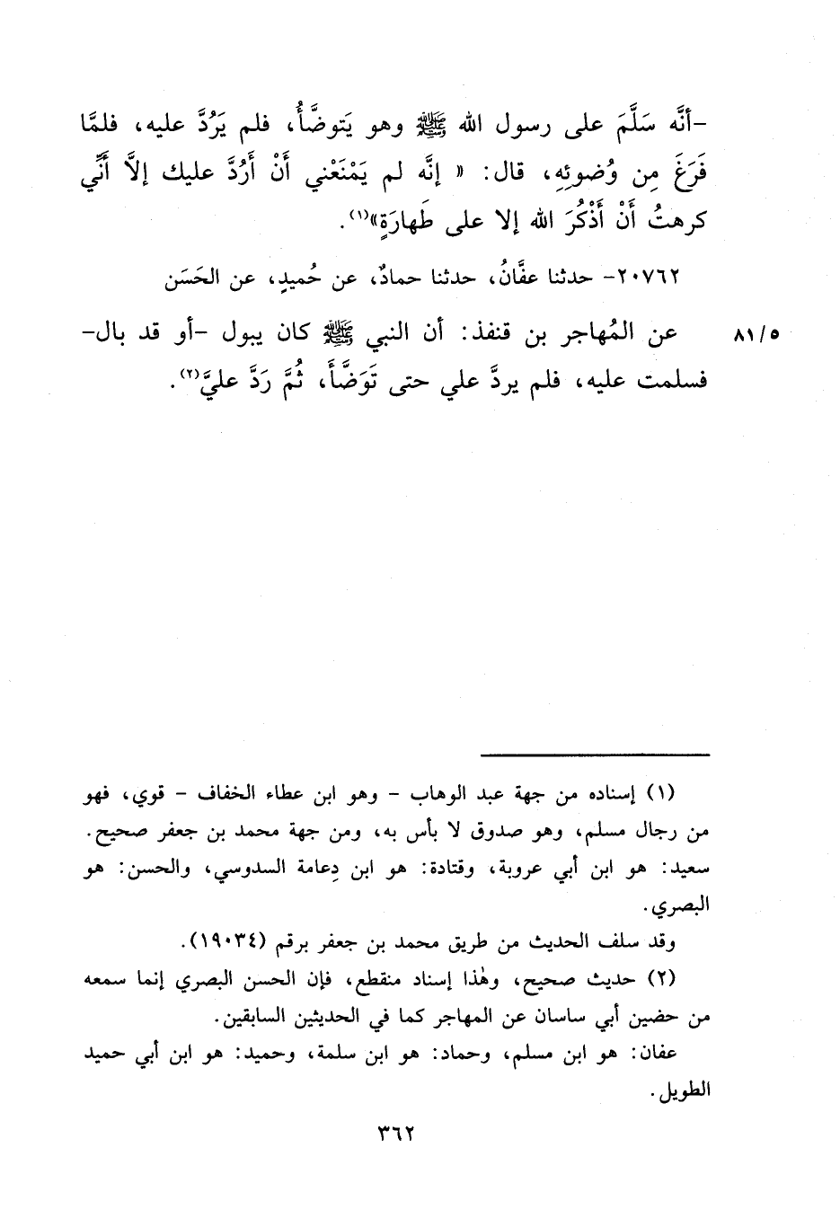 ٢٠٧٦٢ - حَدَّثَنَا عَفَّانُ، حَدَّثَنَا حَمَّادٌ، عَنْ حُمَيْدٍ، عَنِ الْحَسَنِ، عَنِ الْمُهَاجِرِ بْنِ قُنْفُذٍ، " أَنَّ النَّبِيَّ صَلَّى اللهُ عَلَيْهِ وَسَلَّمَ كَانَ يَبُولُ، أَوْ قَدْ بَالَ، فَسَلَّمْتُ عَلَيْهِ، فَلَمْ يَرُدَّ عَلَيَّ حَتَّى تَوَضَّأَ، ثُمَّ رَدَّ عَلَيَّ " (٢)
