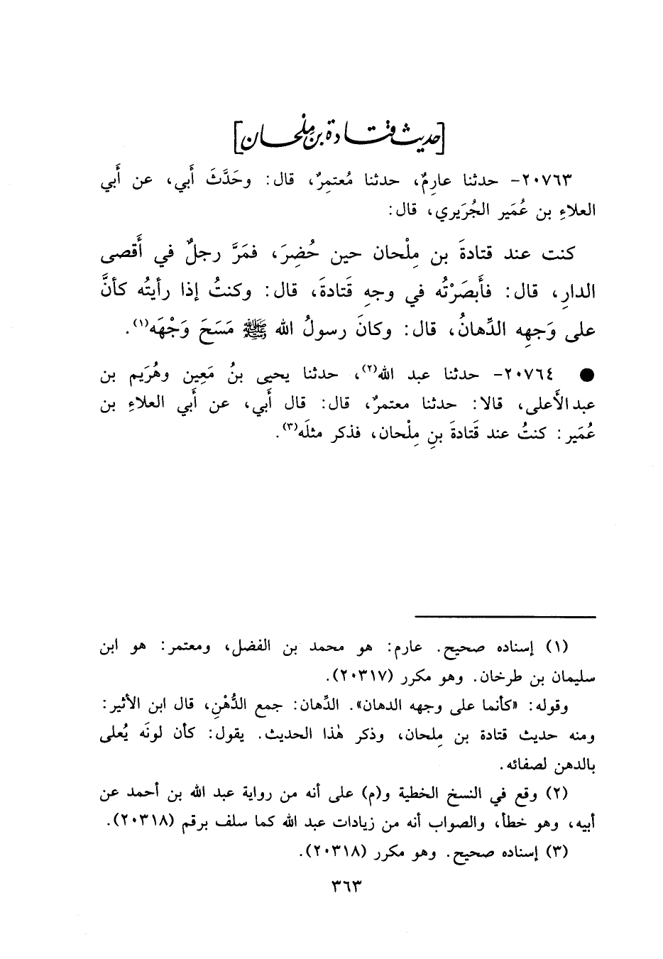 • ٢٠٧٦٤ - حَدَّثَنَا عَبْدُ اللهِ (٢) حَدَّثَنَا يَحْيَى بْنُ مَعِينٍ، وَهُرَيْمُ بْنُ عَبْدِ الْأَعْلَى، قَالَا: حَدَّثَنَا مُعْتَمِرٌ، قَالَ: قَالَ أَبِي، عَنْ أَبِي الْعَلَاءِ بْنِ عُمَيْرٍ، كُنْتُ عِنْدَ قَتَادَةَ بْنِ مِلْحَانَ فَذَكَرَ مِثْلَهُ (٣)