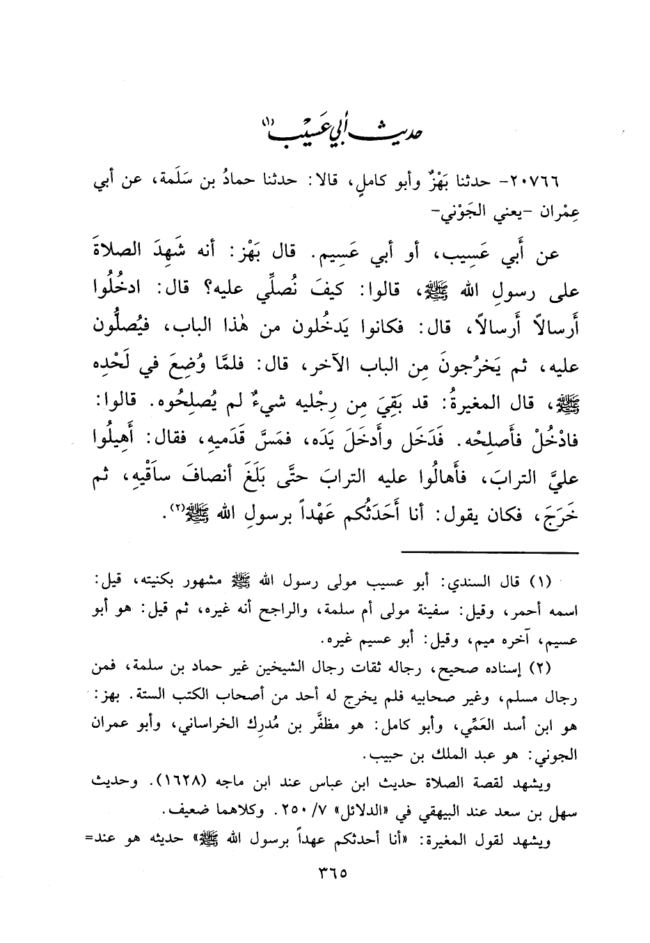 ٢٠٧٦٦ - حَدَّثَنَا بَهْزٌ، وَأَبُو كَامِلٍ، قَالَا: حَدَّثَنَا حَمَّادُ بْنُ سَلَمَةَ، عَنْ أَبِي عِمْرَانَ يَعْنِي الْجَوْنِيَّ، عَنْ أَبِي عَسِيبٍ، أَوْ أَبِي عَسِيمٍ، قَالَ بَهْزٌ: إِنَّهُ شَهِدَ الصَّلَاةَ عَلَى رَسُولِ اللهِ صَلَّى اللهُ عَلَيْهِ وَسَلَّمَ، قَالُوا: كَيْفَ نُصَلِّي عَلَيْهِ؟ قَالَ: " ادْخُلُوا أَرْسَالًا أَرْسَالًا "، قَالَ: " فَكَانُوا يَدْخُلُونَ مِنْ هَذَا الْبَابِ فَيُصَلُّونَ عَلَيْهِ، ثُمَّ يَخْرُجُونَ مِنَ الْبَابِ الْآخَرِ "، قَالَ: " فَلَمَّا وُضِعَ فِي لَحْدِهِ صَلَّى اللهُ عَلَيْهِ وَسَلَّمَ، قَالَ الْمُغِيرَةُ: قَدْ بَقِيَ مِنْ رِجْلَيْهِ شَيْءٌ لَمْ يُصْلِحُوهُ، قَالُوا: فَادْخُلْ فَأَصْلِحْهُ، فَدَخَلَ، وَأَدْخَلَ يَدَهُ فَمَسَّ قَدَمَيْهِ، فَقَالَ: أَهِيلُوا عَلَيَّ التُّرَابَ، فَأَهَالُوا عَلَيْهِ التُّرَابَ، حَتَّى بَلَغَ أَنْصَافَ سَاقَيْهِ، ثُمَّ خَرَجَ، فَكَانَ يَقُولُ أَنَا أَحْدَثُكُمْ عَهْدًا بِرَسُولِ اللهِ صَلَّى اللهُ عَلَيْهِ وَسَلَّمَ " (٢)
