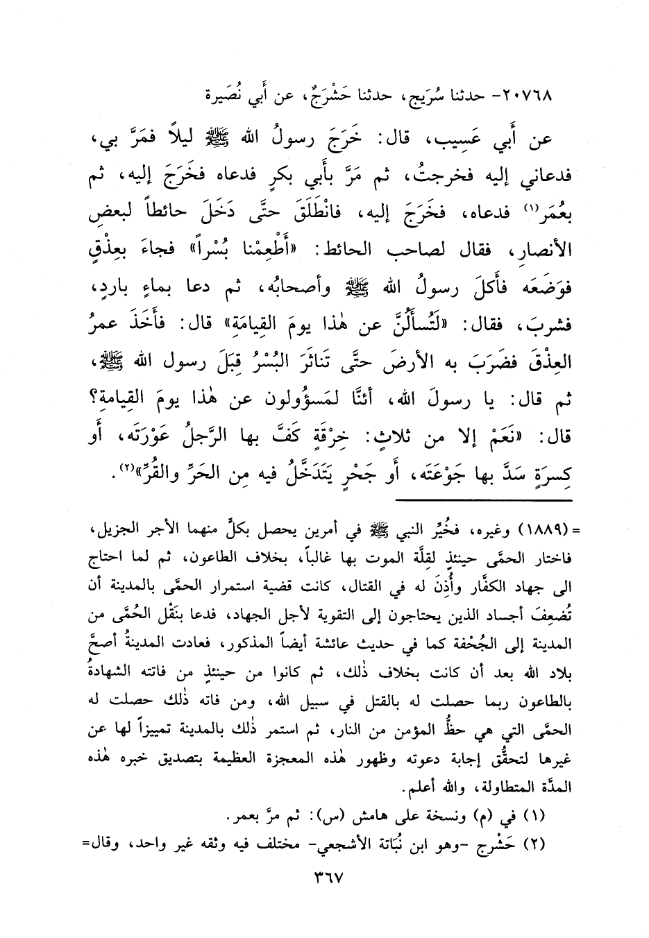 ٢٠٧٦٨ - حَدَّثَنَا سُرَيْجٌ، حَدَّثَنَا حَشْرَجٌ، عَنْ أَبِي نُصَيْرَةَ، عَنْ أَبِي عَسِيبٍ، قَالَ: خَرَجَ رَسُولُ اللهِ صَلَّى اللهُ عَلَيْهِ وَسَلَّمَ لَيْلًا، فَمَرَّ بِي، فَدَعَانِي إِلَيْهِ، فَخَرَجْتُ، ثُمَّ مَرَّ بِأَبِي بَكْرٍ فَدَعَاهُ، فَخَرَجَ إِلَيْهِ، ثُمَّ بِعُمَرَ (١) فَدَعَاهُ، فَخَرَجَ إِلَيْهِ، فَانْطَلَقَ حَتَّى دَخَلَ حَائِطًا لِبَعْضِ الْأَنْصَارِ، فَقَالَ لِصَاحِبِ الْحَائِطِ: أَطْعِمْنَا بُسْرًا، فَجَاءَ بِعِذْقٍ فَوَضَعَهُ، فَأَكَلَ، رَسُولُ اللهِ صَلَّى اللهُ عَلَيْهِ وَسَلَّمَ وَأَصْحَابُهُ، ثُمَّ دَعَا بِمَاءٍ بَارِدٍ فَشَرِبَ، فَقَالَ: " لَتُسْأَلُنَّ عَنْ هَذَا يَوْمَ الْقِيَامَةِ "، قَالَ: فَأَخَذَ عُمَرُ الْعِذْقَ، فَضَرَبَ بِهِ الْأَرْضَ حَتَّى تَنَاثَرَ الْبُسْرُ قِبَلَ رَسُولِ اللهِ صَلَّى اللهُ عَلَيْهِ وَسَلَّمَ، ثُمَّ قَالَ: يَا رَسُولَ اللهِ، أَئِنَّا لَمَسْئُولُونَ عَنْ هَذَا يَوْمَ الْقِيَامَةِ؟ قَالَ: " نَعَمْ، إِلَّا مِنْ ثَلَاثٍ: خِرْقَةٍ كَفَّ بِهَا الرَّجُلُ عَوْرَتَهُ، أَوْ كِسْرَةٍ سَدَّ بِهَا جَوْعَتَهُ، أَوْ حَجَرٍ يَتَدَخَّلُ فِيهِ مِنَ الْحَرِّ، وَالْقُرِّ " (٢)