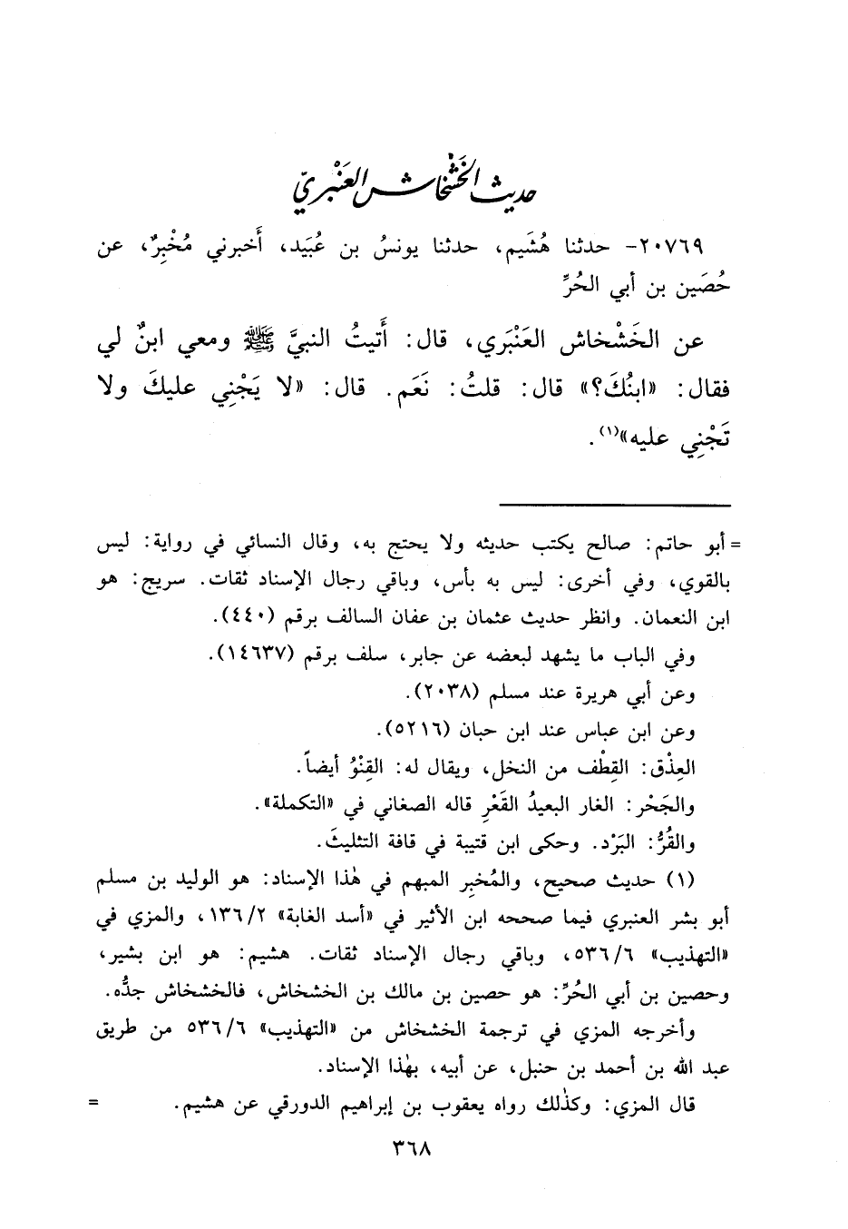 ٢٠٧٦٩ - حَدَّثَنَا هُشَيْمٌ، حَدَّثَنَا يُونُسُ بْنُ عُبَيْدٍ، أَخْبَرَنِي مُخْبِرٌ، عَنْ حُصَيْنِ بْنِ أَبِي الْحَرِّ، عَنِ الْخَشْخَاشِ الْعَنْبَرِيِّ، قَالَ: أَتَيْتُ النَّبِيَّ صَلَّى اللهُ عَلَيْهِ وَسَلَّمَ وَمَعِي ابْنٌ لِي، فَقَالَ: " ابْنُكَ؟ " قَالَ: قُلْتُ: نَعَمْ، قَالَ: " لَا يَجْنِي عَلَيْكَ، وَلَا تَجْنِي عَلَيْهِ " (١)