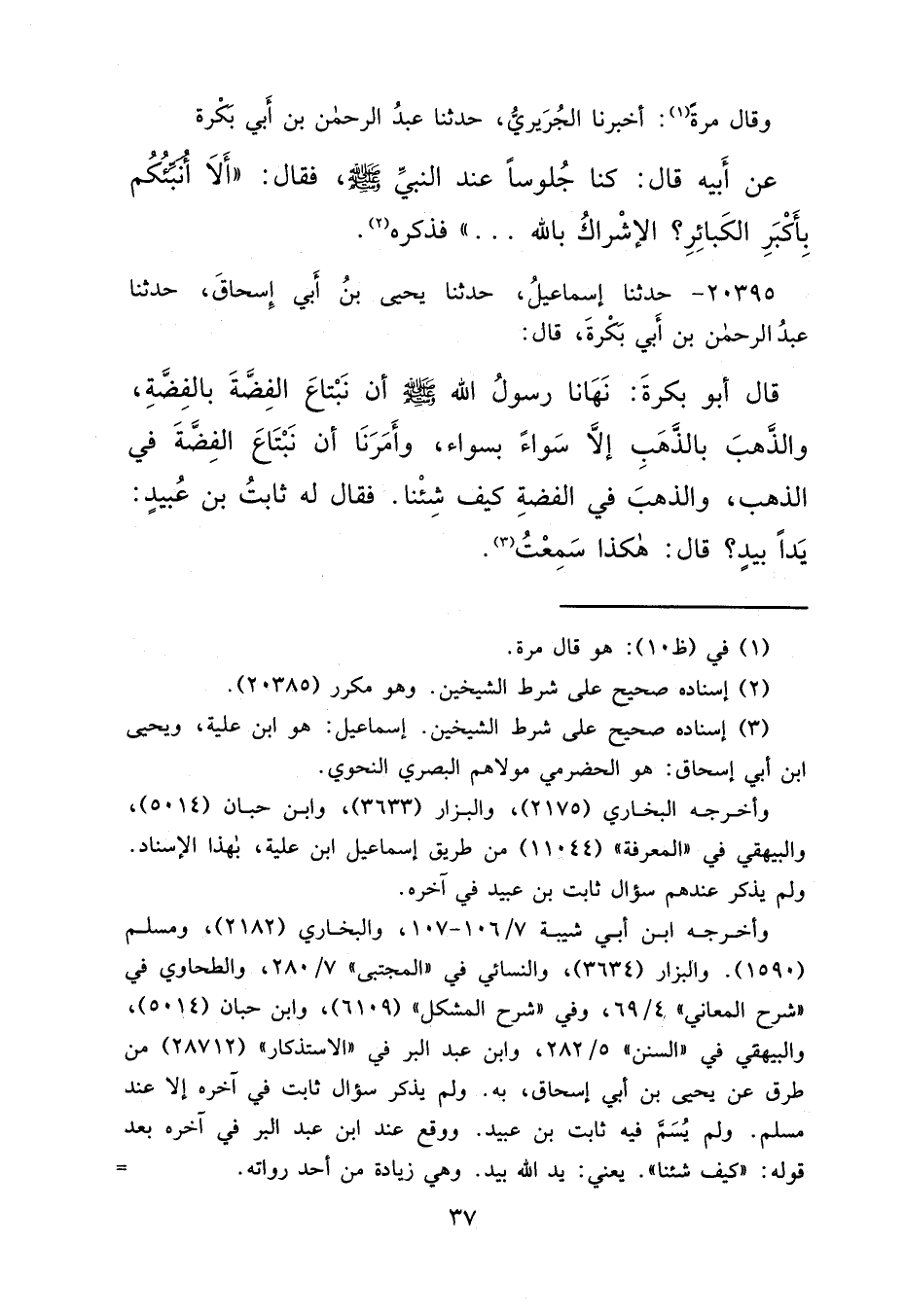 ٢٠٣٩٥ - حَدَّثَنَا إِسْمَاعِيلُ، حَدَّثَنَا يَحْيَى بْنُ أَبِي إِسْحَاقَ، حَدَّثَنَا عَبْدُ الرَّحْمَنِ بْنُ أَبِي بَكَرَةَ، قَالَ: قَالَ أَبُو بَكَرَةَ: " نَهَانَا رَسُولُ اللهِ صَلَّى اللهُ عَلَيْهِ وَسَلَّمَ أَنْ نَبْتَاعَ الْفِضَّةَ بِالْفِضَّةِ، وَالذَّهَبَ بِالذَّهَبِ إِلَّا سَوَاءً بِسَوَاءٍ، وَأَمَرَنَا أَنْ نَبْتَاعَ الْفِضَّةَ فِي الذَّهَبِ، وَالذَّهَبَ فِي الْفِضَّةِ، كَيْفَ شِئْنَا "، فَقَالَ لَهُ ثَابِتُ بْنُ عُبَيْدٍ: يَدًا بِيَدٍ؟ قَالَ: " هَكَذَا سَمِعْتُ " (٣)