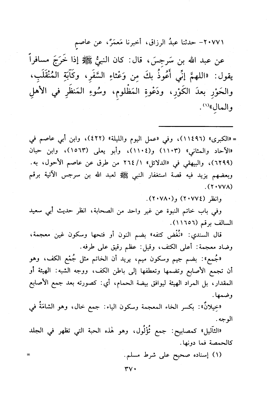 ٢٠٧٧١ - حَدَّثَنَا عَبْدُ الرَّزَّاقِ، أَخْبَرَنَا مَعْمَرٌ، عَنْ عَاصِمٍ، عَنْ عَبْدِ اللهِ بْنِ سَرْجِسَ، قَالَ: كَانَ النَّبِيُّ صَلَّى اللهُ عَلَيْهِ وَسَلَّمَ إِذَا خَرَجَ مُسَافِرًا، يَقُولُ: " اللهُمَّ إِنِّي أَعُوذُ بِكَ مِنْ وَعْثَاءِ السَّفَرِ، وَكَآبَةِ الْمُنْقَلَبِ، وَالْحَوْرِ بَعْدَ الْكَوْرِ، وَدَعْوَةِ الْمَظْلُومِ، وَسُوءِ الْمَنْظَرِ فِي الْأَهْلِ وَالْمَالِ " (١)