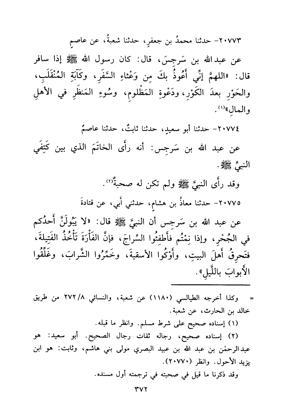 ٢٠٧٧٣ - حَدَّثَنَا مُحَمَّدُ بْنُ جَعْفَرٍ، حَدَّثَنَا شُعْبَةُ، عَنْ عَاصِمٍ، عَنْ عَبْدِ اللهِ بْنِ سَرْجِسَ، قَالَ: كَانَ رَسُولُ اللهِ صَلَّى اللهُ عَلَيْهِ وَسَلَّمَ إِذَا سَافَرَ قَالَ: " اللهُمَّ إِنِّي أَعُوذُ بِكَ مِنْ وَعْثَاءِ السَّفَرِ، وَكَآبَةِ الْمُنْقَلَبِ، وَالْحَوْرِ بَعْدَ الْكَوْرِ، وَدَعْوَةِ الْمَظْلُومِ، وَسُوءِ الْمَنْظَرِ فِي الْأَهْلِ وَالْمَالِ " (١)