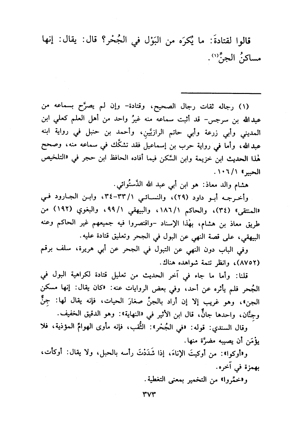 قلنا: وأما ما جاء في آخر الحديث من تعليل قتادة لكراهية البول في الجُحر فلم يأثره عن أحد، وفي بعض الروايات عنه: "كان يقال: إنها مسكن الجن"، وهو غريب إلا إن أراد بالجنِّ صغارَ الحيات، فإنه يقال لها: جِنٌّ وجِنَّان، واحدها جانٌّ، قال ابن الأثير في "النهاية": وهو الدقيق الخفيف.