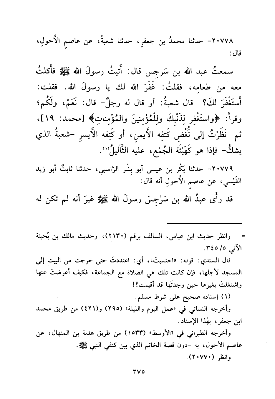 ٢٠٧٧٨ - حَدَّثَنَا مُحَمَّدُ بْنُ جَعْفَرٍ، حَدَّثَنَا شُعْبَةُ، عَنْ عَاصِمٍ الْأَحْوَلِ، قَالَ: سَمِعْتُ عَبْدَ اللهِ بْنَ سَرْجِسَ، قَالَ: أَتَيْتُ رَسُولَ اللهِ صَلَّى اللهُ عَلَيْهِ وَسَلَّمَ فَأَكَلْتُ مَعَهُ مِنْ طَعَامِهِ، فَقُلْتُ: غَفَرَ اللهُ لَكَ يَا رَسُولَ اللهِ، فَقُلْتُ: أَسْتَغْفَرَ لَكَ؟، قَالَ شُعْبَةُ: أَوْ قَالَ لَهُ رَجُلٌ، قَالَ: نَعَمْ، وَلَكُمْ، وَقَرَأَ: {وَاسْتَغْفِرْ لِذَنْبِكَ وَلِلْمُؤْمِنِينَ وَالْمُؤْمِنَاتِ} [محمد: ١٩] ، " ثُمَّ نَظَرْتُ إِلَى نُغْضِ كَتِفِهِ الْأَيْمَنِ، أَوْ كَتِفِهِ الْأَيْسَرِ شُعْبَةُ الَّذِي يَشُكُّ، فَإِذَا هُوَ كَهَيْئَةِ الْجُمْعِ عَلَيْهِ، الثَّآلِيلُ " (١)