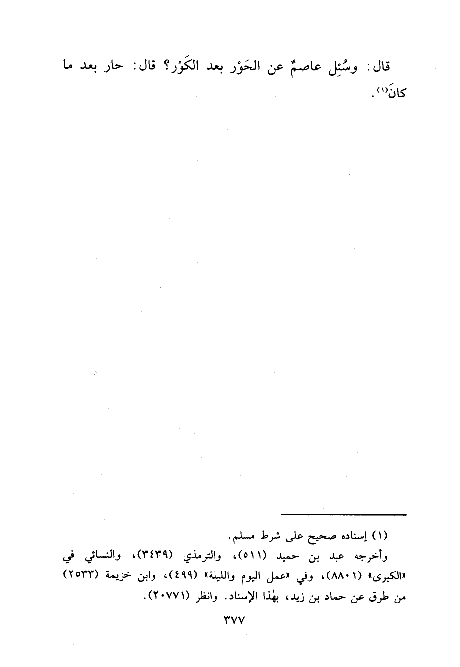 قَالَ: وَسُئِلَ عَاصِمٌ عَنِ الْحَوْرِ بَعْدَ الْكَوْرِ؟ قَالَ: " حَارَ بَعْدَ مَا كَانَ " (١)