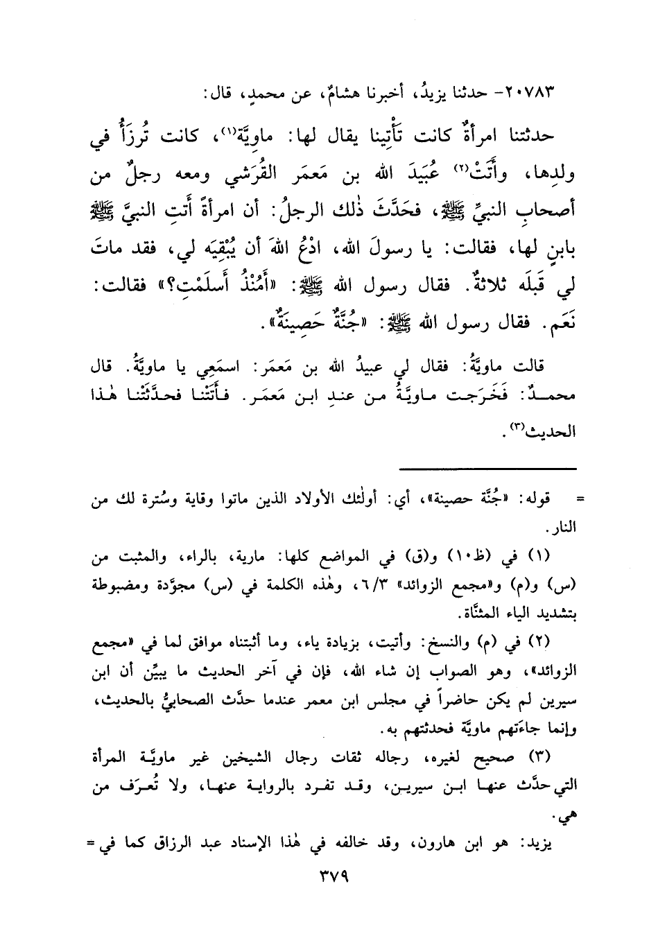 ٢٠٧٨٣ - حَدَّثَنَا يَزِيدُ، أَخْبَرَنَا هِشَامٌ، عَنْ مُحَمَّدٍ، قَالَ: حَدَّثَتْنَا امْرَأَةٌ كَانَتْ تَأْتِينَا يُقَالُ لَهَا: مَاوِيَّةُ، (١) كَانَتْ تُرْزَأُ فِي وَلَدِهَا، وَأَتَتْ (٢) عُبَيْدَ اللهِ بْنَ مَعْمَرٍ الْقُرَشِيَّ، وَمَعَهُ رَجُلٌ مِنْ أَصْحَابِ النَّبِيِّ صَلَّى اللهُ عَلَيْهِ وَسَلَّمَ، فَحَدَّثَ ذَلِكَ الرَّجُلُ، أَنَّ امْرَأَةً أَتَتِ النَّبِيَّ صَلَّى اللهُ عَلَيْهِ وَسَلَّمَ بِابْنٍ لَهَا، فَقَالَتْ: يَا رَسُولَ اللهِ، ادْعُ اللهَ أَنْ يُبْقِيَهُ لِي، فَقَدْ مَاتَ لِي قَبْلَهُ ثَلَاثَةٌ، فَقَالَ رَسُولُ اللهِ صَلَّى اللهُ عَلَيْهِ وَسَلَّمَ: " أَمُنْذُ أَسْلَمْتِ؟ "، فَقَالَتْ: نَعَمْ، فَقَالَ رَسُولُ اللهِ صَلَّى اللهُ عَلَيْهِ وَسَلَّمَ: " جُنَّةٌ حَصِينَةٌ "، قَالَتْ مَاوِيَّةُ: فَقَالَ لِي عُبَيْدُ اللهِ بْنُ مَعْمَرٍ: " اسْمَعِي يَا مَاوِيَّةُ "، قَالَ مُحَمَّدٌ: " فَخَرَجَتْ مَاوِيَّةُ مِنْ عِنْدِ ابْنِ مَعْمَرٍ، فَأَتَتْنَا فَحَدَّثَتْنَا هَذَا الْحَدِيثَ " (٣)