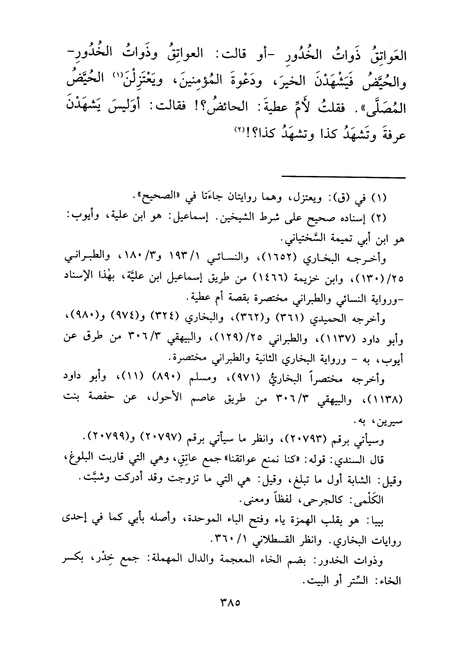 الْعَوَاتِقُ ذَوَاتُ الْخُدُورِ، أَوْ قَالَتْ: الْعَوَاتِقُ وَذَوَاتُ الْخُدُورِ، وَالْحُيَّضُ فَيَشْهَدْنَ الْخَيْرَ، وَدَعْوَةَ الْمُؤْمِنِينَ، وَيَعْتَزِلْنَ (١) الْحُيَّضُ الْمُصَلَّى "، فَقُلْتُ لِأُمِّ عَطِيَّةَ: الْحَائِضُ؟ ، فَقَالَتْ: " أَوَ لَيْسَ يَشْهَدْنَ عَرَفَةَ وَتَشْهَدُ كَذَا، وَتَشْهَدُ كَذَا؟ " (٢)