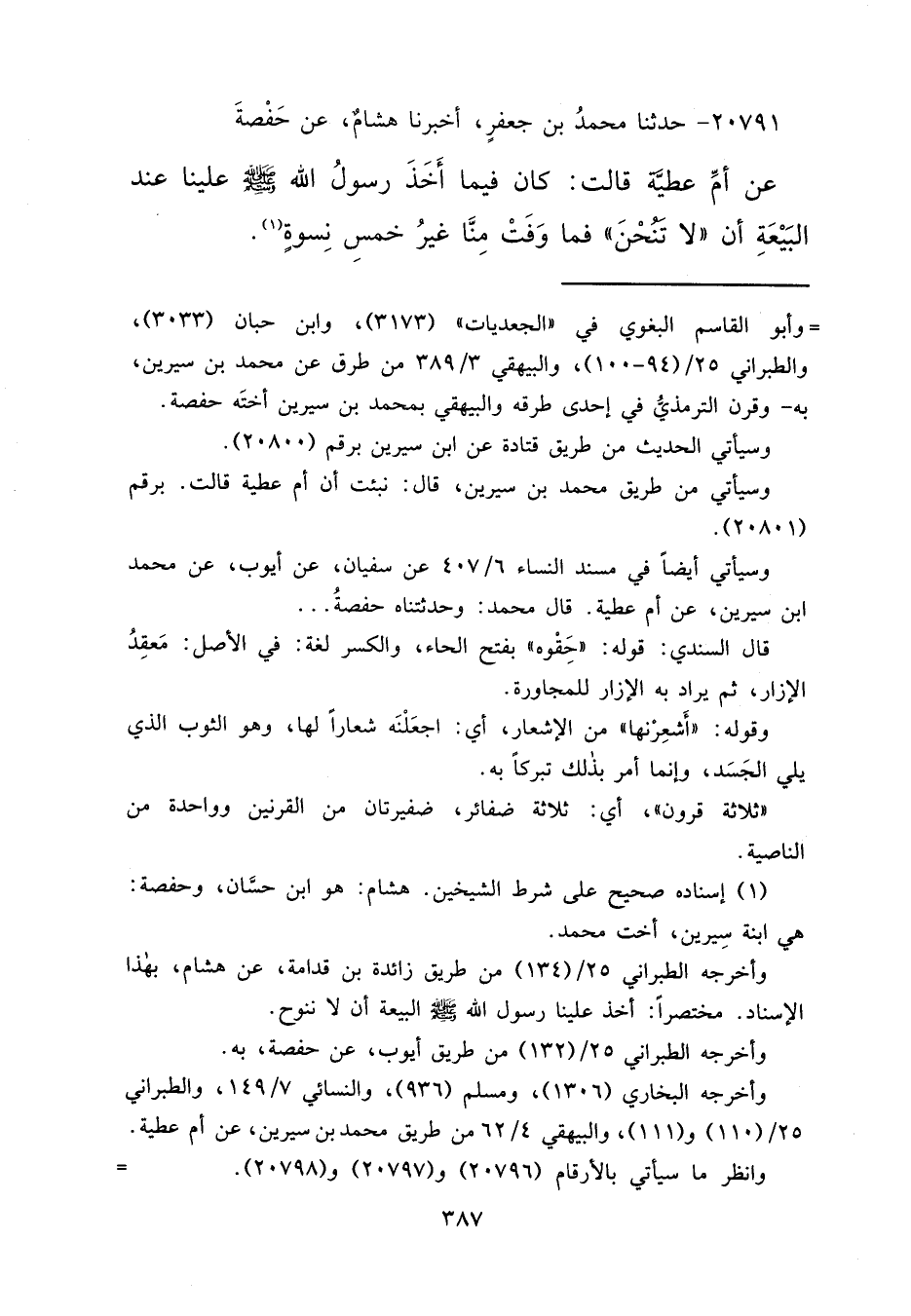 ٢٠٧٩١ - حَدَّثَنَا مُحَمَّدُ بْنُ جَعْفَرٍ، أَخْبَرَنَا هِشَامٌ، عَنْ حَفْصَةَ، عَنْ أُمِّ عَطِيَّةَ، قَالَتْ: كَانَ فِيمَا أَخَذَ رَسُولُ اللهِ صَلَّى اللهُ عَلَيْهِ وَسَلَّمَ عَلَيْنَا عِنْدَ الْبَيْعَةِ أَنْ: " لَا تَنُحْنَ "، فَمَا وَفَتْ مِنَّا غَيْرُ خَمْسِ نِسْوَةٍ (١)