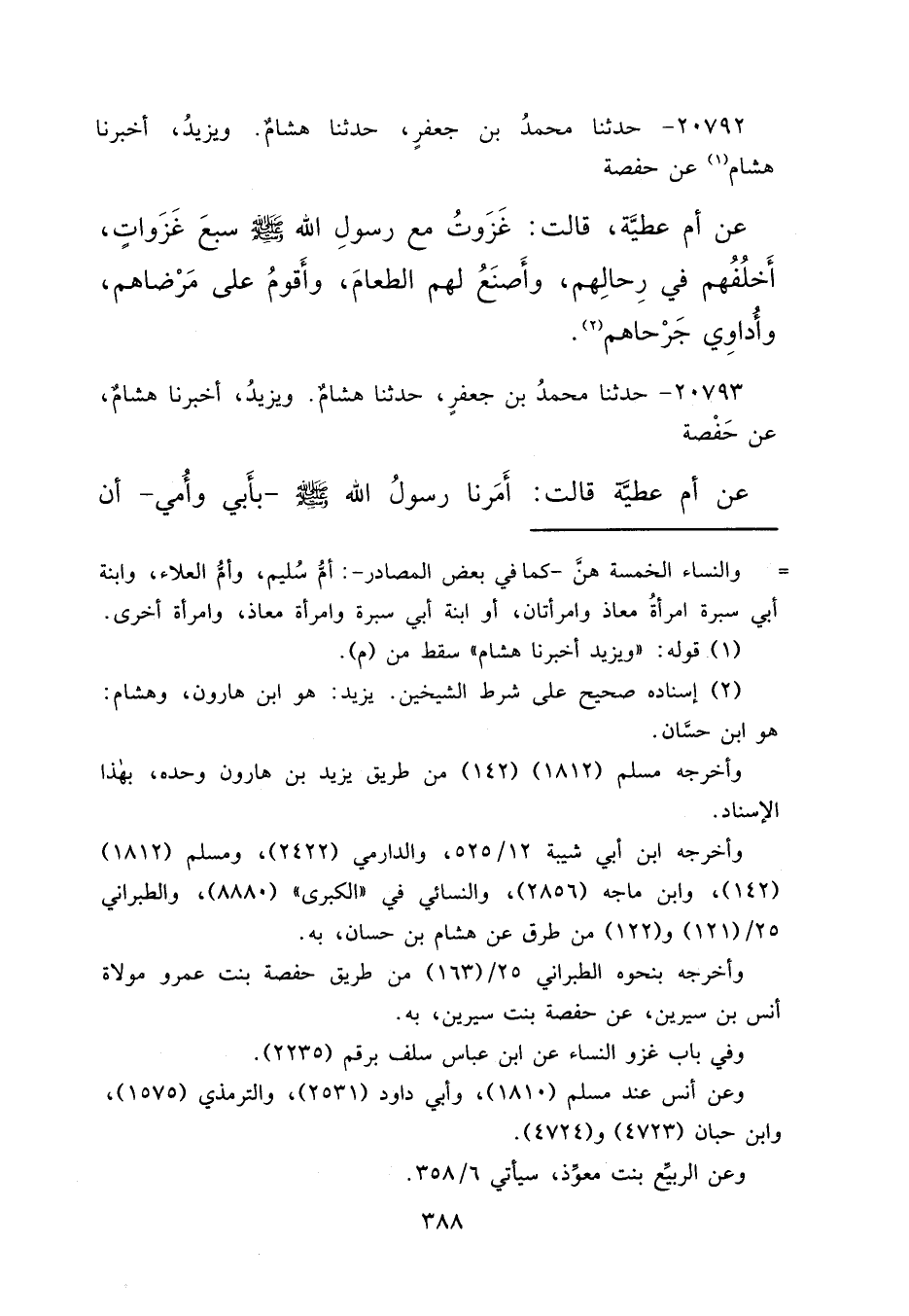 ٢٠٧٩٢ - حَدَّثَنَا مُحَمَّدُ بْنُ جَعْفَرٍ، حَدَّثَنَا هِشَامٌ، وَيَزِيدُ، أَخْبَرَنَا هِشَامٌ (١) عَنْ حَفْصَةَ، عَنْ أُمِّ عَطِيَّةَ، قَالَتْ: " غَزَوْتُ مَعَ رَسُولِ اللهِ صَلَّى اللهُ عَلَيْهِ وَسَلَّمَ سَبْعَ غَزَوَاتٍ، أَخْلُفُهُمْ فِي رِحَالِهِمْ، وَأَصْنَعُ لَهُمُ الطَّعَامَ، وَأَقُومُ عَلَى مَرْضَاهُمْ، وَأُدَاوِي جَرْحَاهُمْ " (٢)