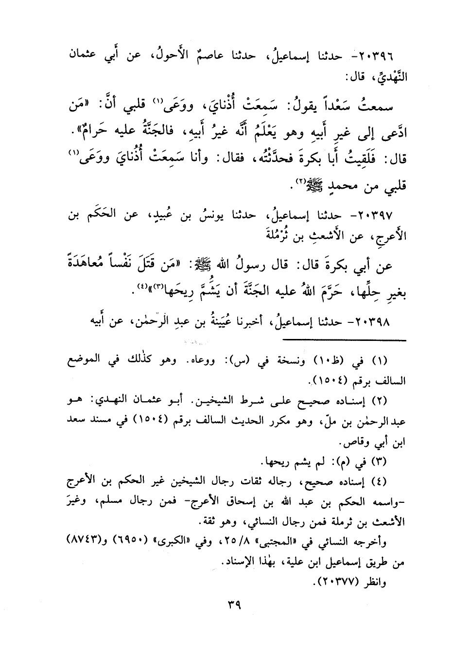 ٢٠٣٩٦ - حَدَّثَنَا إِسْمَاعِيلُ، حَدَّثَنَا عَاصِمٌ الْأَحْوَلُ، عَنْ أَبِي عُثْمَانَ النَّهْدِيِّ، قَالَ: سَمِعْتُ سَعْدًا، يَقُولُ: سَمِعَتْ أُذُنَايَ، وَوَعَى (١) قَلْبِي، " أَنَّ مَنْ ادَّعَى إِلَى غَيْرِ أَبِيهِ وَهُوَ يَعْلَمُ أَنَّهُ غَيْرُ أَبِيهِ، فَالْجَنَّةُ عَلَيْهِ حَرَامٌ "، قَالَ: فَلَقِيتُ أَبَا بَكْرَةَ، فَحَدَّثْتُهُ، فَقَالَ: وَأَنَا سَمِعَتْ أُذُنَايَ، وَوَعَى (١) قَلْبِي مِنْ مُحَمَّدٍ صَلَّى اللهُ عَلَيْهِ وَسَلَّمَ (٢)