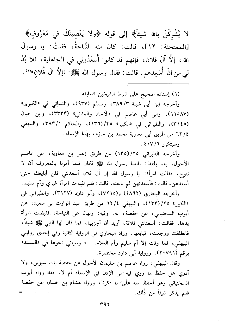 لَا يُشْرِكْنَ بِاللهِ شَيْئًا} [الممتحنة: ١٢] إِلَى قَوْلِهِ: {وَلَا يَعْصِينَكَ فِي مَعْرُوفٍ} [الممتحنة: ١٢] ، قَالَتْ: كَانَ مِنْهُ النِّيَاحَةُ، فَقُلْتُ: يَا رَسُولَ اللهِ، إِلَّا آلَ فُلَانٍ، فَإِنَّهُمْ قَدْ كَانُوا أَسْعَدُونِي فِي الْجَاهِلِيَّةِ، فَلَا بُدَّ لِي مِنْ أَنْ أُسْعِدَهُمْ، قَالَتْ: فَقَالَ رَسُولُ اللهِ صَلَّى اللهُ عَلَيْهِ وَسَلَّمَ: " إِلَّا آلَ فُلَانٍ " (١)