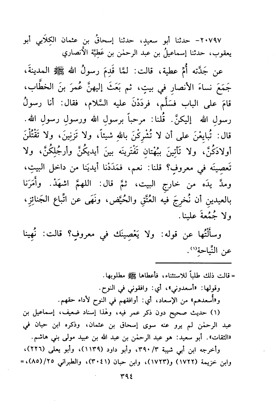 ٢٠٧٩٧ - حَدَّثَنَا أَبُو سَعِيدٍ، حَدَّثَنَا إِسْحَاقُ بْنُ عُثْمَانَ الْكِلَابِيُّ أَبُو يَعْقُوبَ، حَدَّثَنَا إِسْمَاعِيلُ بْنُ عَبْدِ الرَّحْمَنِ بْنِ عَطِيَّةَ الْأَنْصَارِيُّ، عَنْ جَدَّتِهِ أُمِّ عَطِيَّةَ، قَالَتْ: لَمَّا قَدِمَ رَسُولُ اللهِ صَلَّى اللهُ عَلَيْهِ وَسَلَّمَ الْمَدِينَةَ، جَمَعَ نِسَاءَ الْأَنْصَارِ فِي بَيْتٍ، ثُمَّ بَعَثَ إِلَيْهِنَّ عُمَرَ بْنَ الْخَطَّابِ، قَامَ عَلَى الْبَابِ، فَسَلَّمَ، فَرَدَدْنَ عَلَيْهِ السَّلَامَ، فَقَالَ: أَنَا رَسُولُ رَسُولِ اللهِ إِلَيْكُنَّ، قُلْنَا: مَرْحَبًا بِرَسُولِ اللهِ، وَرَسُولِ رَسُولِ اللهِ، قَالَ: " تُبَايِعْنَ عَلَى أَنْ لَا تُشْرِكْنَ بِاللهِ شَيْئًا، وَلَا تَزْنِينَ، وَلَا تَقْتُلْنَ أَوْلَادَكُنَّ، وَلَا تَأْتِينَ بِبُهْتَانٍ تَفْتَرِينَهُ بَيْنَ أَيْدِيكُنَّ وَأَرْجُلِكُنَّ، وَلَا تَعْصِينَهُ فِي مَعْرُوفٍ؟ "، قُلْنَا: نَعَمْ، فَمَدَدْنَا أَيْدِيَنَا مِنْ دَاخِلِ الْبَيْتِ، وَمَدَّ يَدَهُ مِنْ خَارِجِ الْبَيْتِ، ثُمَّ قَالَ: " اللهُمَّ اشْهَدْ، وَأَمَرَنَا بِالْعِيدَيْنِ أَنْ نُخْرِجَ فِيهِ الْعُتَّقَ، وَالْحُيَّضَ، وَنَهَى عَنْ اتِّبَاعِ الْجَنَائِزِ، وَلَا جُمُعَةَ عَلَيْنَا "، وَسَأَلْتُهَا عَنْ قَوْلِهِ: {وَلَا يَعْصِينَكَ فِي مَعْرُوفٍ} [الممتحنة: ١٢] ، قَالَتْ: " نُهِينَا عَنِ النِّيَاحَةِ " (١)