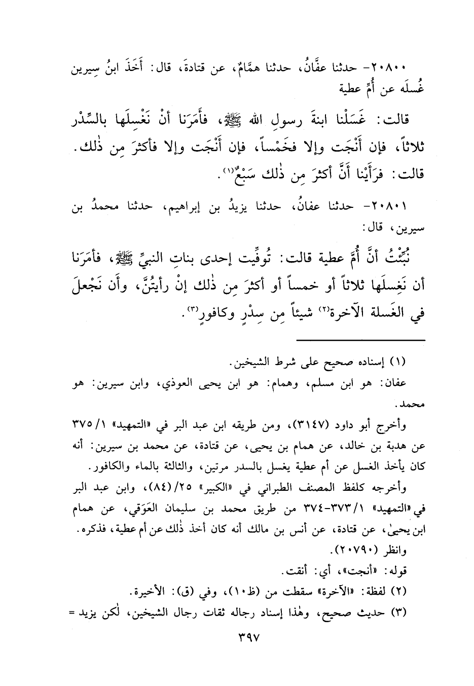 ٢٠٨٠٠ - حَدَّثَنَا عَفَّانُ، حَدَّثَنَا هَمَّامٌ، عَنْ قَتَادَةَ، قَالَ: أَخَذَ ابْنُ سِيرِينَ غُسْلَهُ عَنْ أُمِّ عَطِيَّةَ، قَالَتْ: " غَسَّلْنَا ابْنَةَ رَسُولِ اللهِ صَلَّى اللهُ عَلَيْهِ وَسَلَّمَ، فَأَمَرَنَا أَنْ نَغْسِلَهَا بِالسِّدْرِ ثَلَاثًا، فَإِنْ أَنْجَتْ وَإِلَّا فَخَمْسًا، فَإِنْ أَنْجَتْ وَإِلَّا فَأَكْثَرَ مِنْ ذَلِكَ "، قَالَتْ: " فَرَأَيْنَا أَنَّ أَكْثَرَ مِنْ ذَلِكَ سَبْعٌ " (١)