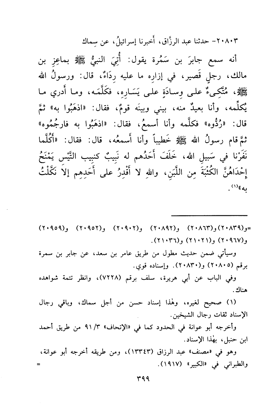 ٢٠٨٠٣ - حَدَّثَنَا عَبْدُ الرَّزَّاقِ، أَخْبَرَنَا إِسْرَائِيلُ، عَنْ سِمَاكٍ، أَنَّهُ سَمِعَ جَابِرَ بْنَ سَمُرَةَ، يَقُولُ: أُتِيَ النَّبِيُّ صَلَّى اللهُ عَلَيْهِ وَسَلَّمَ بمَاعِزِ بْنِ مَالِكٍ، رَجُلٍ قَصِيرٍ، فِي إِزَارِهِ مَا عَلَيْهِ رِدَاءٌ، قَالَ: وَرَسُولُ اللهِ صَلَّى اللهُ عَلَيْهِ وَسَلَّمَ مُتَّكِئٌ عَلَى وِسَادَةٍ عَلَى يَسَارِهِ، فَكَلَّمَهُ، وَمَا أَدْرِي مَا يُكَلِّمُهُ، وَأَنَا بَعِيدٌ مِنْهُ، بَيْنِي وَبَيْنَهُ قَوْمٌ، فَقَالَ: " اذْهَبُوا بِهِ "، ثُمَّ قَالَ: رُدُّوهُ، فَكَلَّمَهُ، وَأَنَا أَسْمَعُ، فَقَالَ: " اذْهَبُوا بِهِ، فَارْجُمُوهُ "، ثُمَّ قَامَ رَسُولُ اللهِ صَلَّى اللهُ عَلَيْهِ وَسَلَّمَ، خَطِيبًا، وَأَنَا أَسْمَعُهُ، قَالَ: فَقَالَ: " أَكُلَّمَا نَفَرْنَا فِي سَبِيلِ اللهِ، خَلَفَ أَحَدُهُمْ لَهُ نَبِيبٌ كَنَبِيبِ التَّيْسِ، يَمْنَحُ إِحْدَاهُنَّ الْكُثْبَةَ مِنَ اللَّبَنِ، وَاللهِ لَا أَقْدِرُ عَلَى أَحَدِهِمْ إِلَّا نَكَّلْتُ بِهِ " (١)