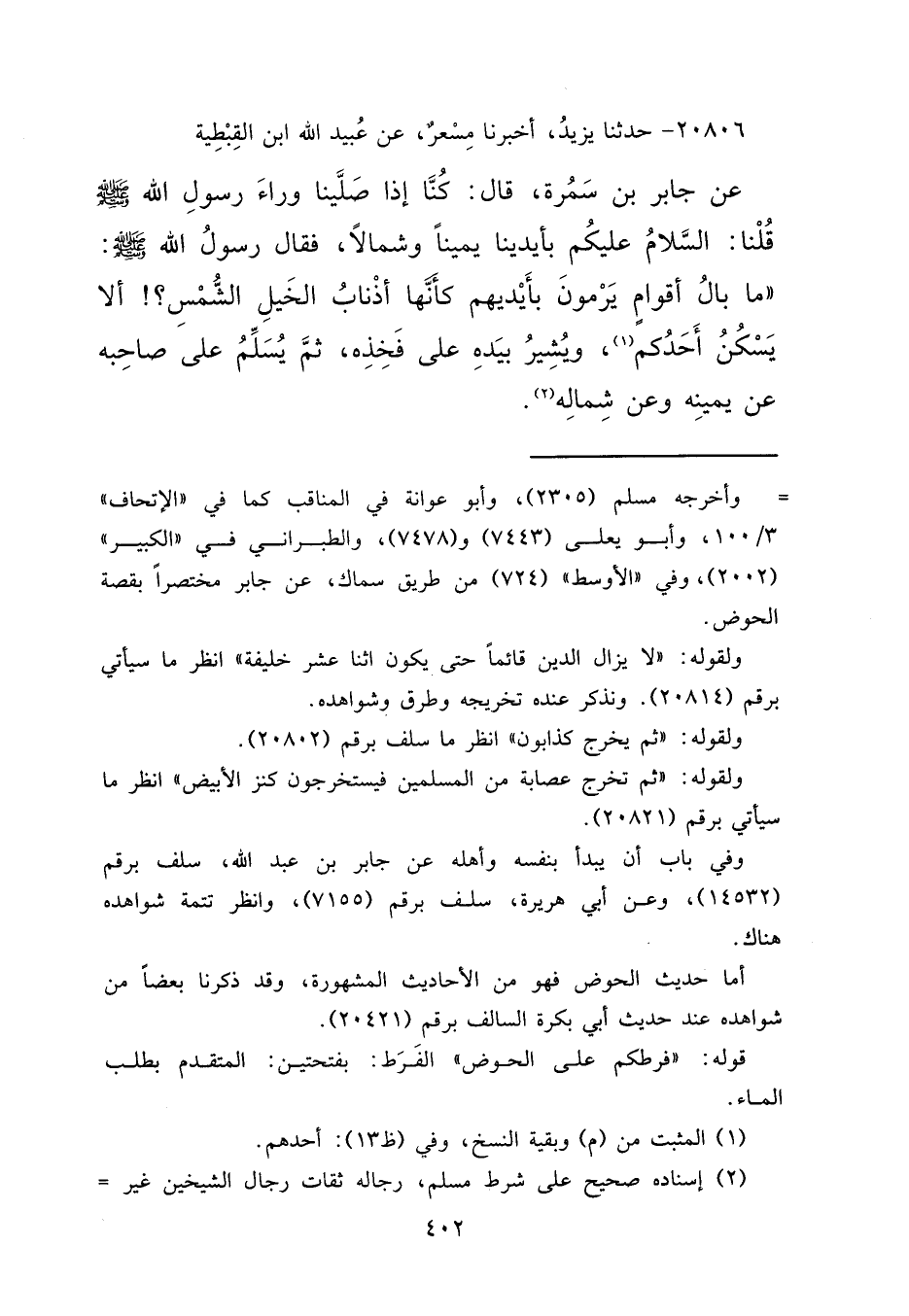 ٢٠٨٠٦ - حَدَّثَنَا يَزِيدُ، أَخْبَرَنَا مِسْعَرٌ، عَنْ عُبَيْدِ اللهِ ابْنِ الْقِبْطِيَّةِ، عَنْ جَابِرِ بْنِ سَمُرَةَ، قَالَ: كُنَّا إِذَا صَلَّيْنَا وَرَاءَ رَسُولِ اللهِ صَلَّى اللهُ عَلَيْهِ وَسَلَّمَ، قُلْنَا: السَّلَامُ عَلَيْكُمْ بِأَيْدِينَا يَمِينًا، وَشِمَالًا، فَقَالَ رَسُولُ اللهِ صَلَّى اللهُ عَلَيْهِ وَسَلَّمَ: " مَا بَالُ أَقْوَامٍ يَرْمُونَ بِأَيْدِيهِمْ كَأَنَّهَا أَذْنَابُ الْخَيْلِ الشُّمْسِ، أَلَا يَسْكُنُ أَحَدُكُمْ، (١) وَيُشِيرُ بِيَدِهِ عَلَى فَخِذِهِ، ثُمَّ يُسَلِّمُ عَلَى صَاحِبِهِ عَنْ يَمِينِهِ، وَعَنْ شِمَالِهِ " (٢)