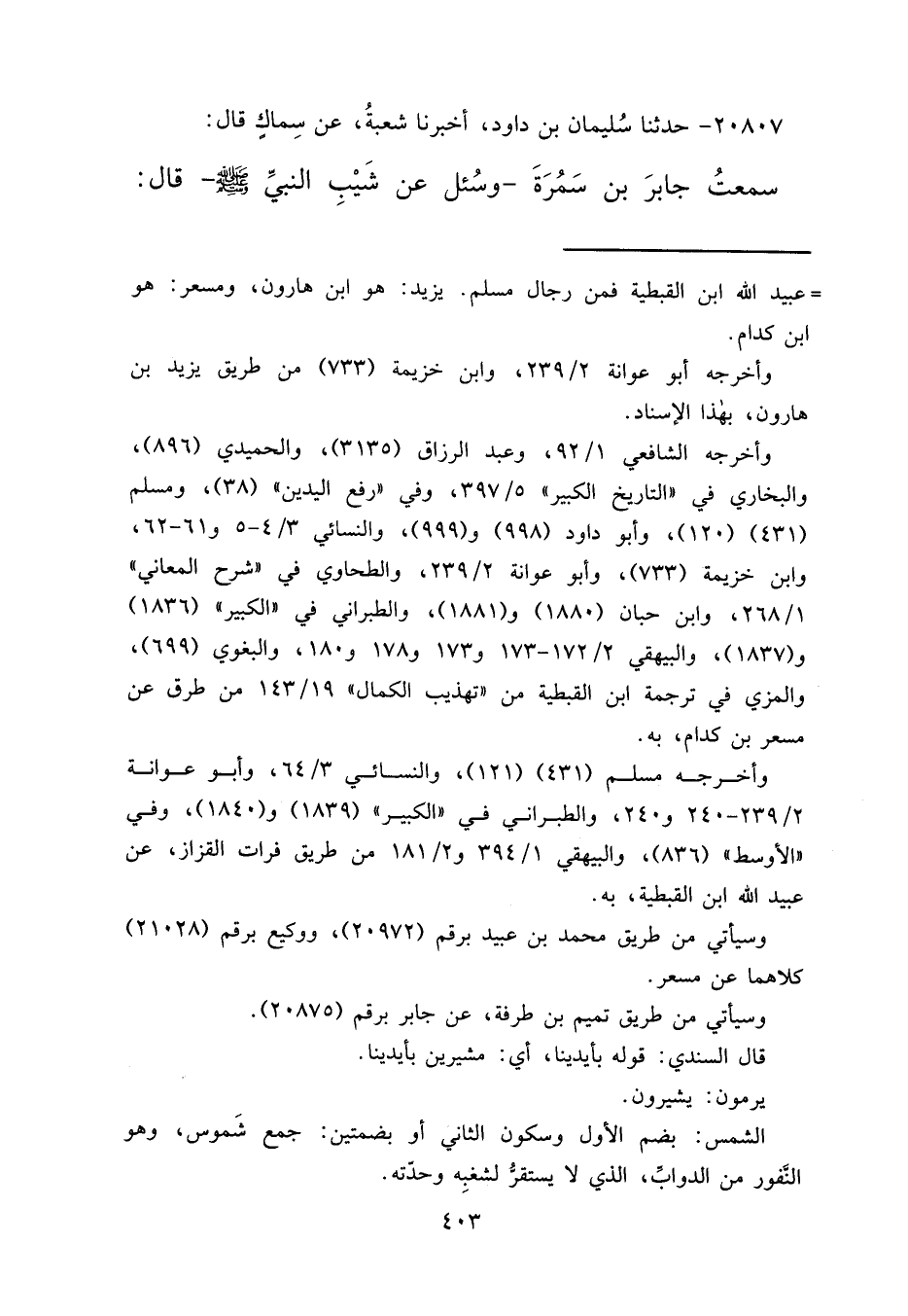 ٢٠٨٠٧ - حَدَّثَنَا سُلَيْمَانُ بْنُ دَاوُدَ، أَخْبَرَنَا شُعْبَةُ، عَنْ سِمَاكٍ قَالَ: سَمِعْتُ جَابِرَ بْنَ سَمُرَةَ، وَسُئِلَ عَنْ شَيْبِ النَّبِيِّ صَلَّى اللهُ عَلَيْهِ وَسَلَّمَ، قَالَ: "