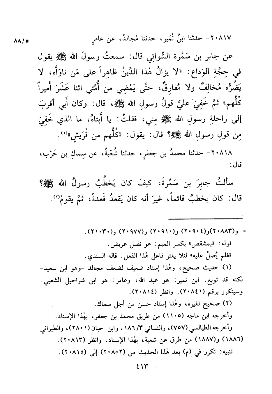 ٢٠٨١٧ - حَدَّثَنَا ابْنُ نُمَيْرٍ، حَدَّثَنَا مُجَالِدٌ، عَنْ عَامِرٍ، عَنْ جَابِرِ بْنِ سَمُرَةَ السُّوَائِيِّ، قَالَ: سَمِعْتُ رَسُولَ اللهِ صَلَّى اللهُ عَلَيْهِ وَسَلَّمَ، يَقُولُ فِي حَجَّةِ الْوَدَاعِ: " لَا يَزَالُ هَذَا الدِّينُ ظَاهِرًا عَلَى مَنْ نَاوَأَهُ، لَا يَضُرُّهُ مُخَالِفٌ، وَلَا مُفَارِقٌ، حَتَّى يَمْضِيَ مِنْ أُمَّتِي اثْنَا عَشَرَ أَمِيرًا، كُلُّهُمْ " ثُمَّ خَفِيَ عَلَيَّ قَوْلُ رَسُولِ اللهِ صَلَّى اللهُ عَلَيْهِ وَسَلَّمَ، قَالَ: وَكَانَ أَبِي أَقْرَبَ إِلَى رَاحِلَةِ رَسُولِ اللهِ صَلَّى اللهُ عَلَيْهِ وَسَلَّمَ مِنِّي، فَقُلْتُ: يَا أَبَتَاهُ، مَا الَّذِي خَفِيَ مِنْ قَوْلِ رَسُولِ اللهِ صَلَّى اللهُ عَلَيْهِ وَسَلَّمَ؟ قَالَ: يَقُولُ: " كُلُّهُمْ مِنْ قُرَيْشٍ " (١)