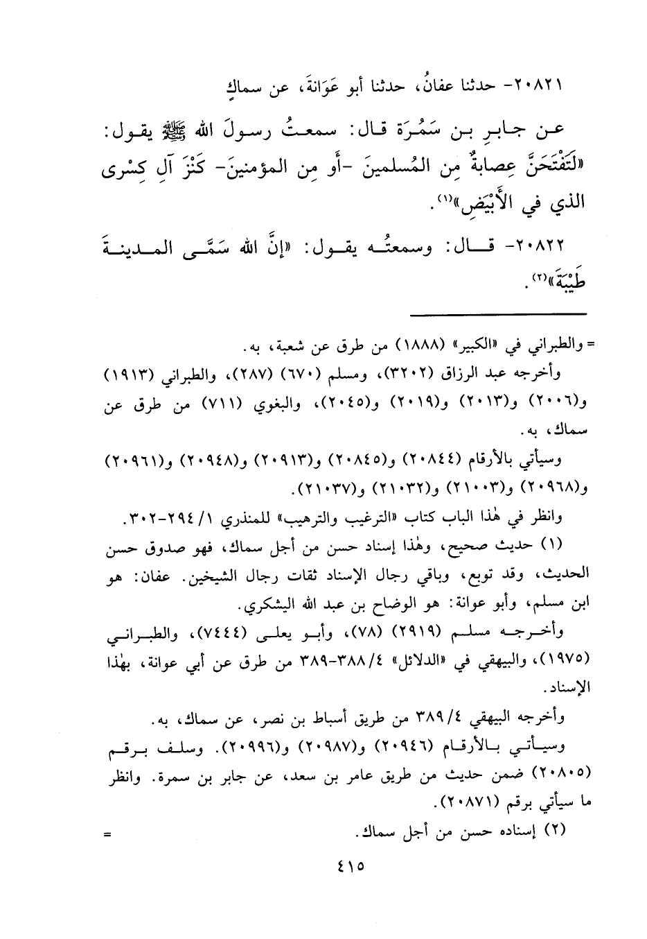 ٢٠٨٢١ - حَدَّثَنَا عَفَّانُ، حَدَّثَنَا أَبُو عَوَانَةَ، عَنْ سِمَاكٍ، عَنْ جَابِرِ بْنِ سَمُرَةَ، قَالَ: سَمِعْتُ رَسُولَ اللهِ صَلَّى اللهُ عَلَيْهِ وَسَلَّمَ يَقُولُ: " لَتَفْتَحَنَّ عِصَابَةٌ مِنَ الْمُسْلِمِينَ، أَوْ مِنَ الْمُؤْمِنِينَ، كَنْزَ آلِ كِسْرَى الَّذِي فِي الْأَبْيَضِ " (١)
