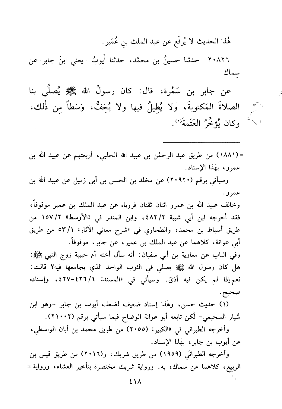 ٢٠٨٢٦ - حَدَّثَنَا حُسَيْنُ بْنُ مُحَمَّدٍ، حَدَّثَنَا أَيُّوبُ يَعْنِي ابْنَ جَابِرٍ، عَنْ سِمَاكٍ، عَنْ جَابِرِ بْنِ سَمُرَةَ، قَالَ: " كَانَ رَسُولُ اللهِ صَلَّى اللهُ عَلَيْهِ وَسَلَّمَ يُصَلِّي بِنَا الصَّلَاةَ الْمَكْتُوبَةَ، وَلَا يُطِيلُ فِيهَا، وَلَا يُخِفُّ، وَسَطًا مِنْ ذَلِكَ، وَكَانَ يُؤَخِّرُ الْعَتَمَةَ " (١)