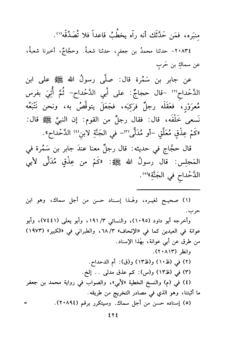 ٢٠٨٣٤ - حَدَّثَنَا مُحَمَّدُ بْنُ جَعْفَرٍ، حَدَّثَنَا شُعْبَةُ، وَحَجَّاجٌ، أَخْبَرَنَا شُعْبَةُ، عَنْ سِمَاكِ بْنِ حَرْبٍ، عَنْ جَابِرِ بْنِ سَمُرَةَ، قَالَ: صَلَّى رَسُولُ اللهِ صَلَّى اللهُ عَلَيْهِ وَسَلَّمَ عَلَى ابْنِ الدَّحْدَاحِ، قَالَ حَجَّاجٌ: عَلَى أَبِي الدَّحْدَاحِ، (٢) ثُمَّ أُتِيَ بِفَرَسٍ مَعْرُورٍ، فَعَقَلَهُ رَجُلٌ فَرَكِبَهُ، فَجَعَلَ يَتَوَقَّصُ بِهِ، وَنَحْنُ نَتَّبِعُهُ نَسْعَى خَلْفَهُ، قَالَ: فَقَالَ رَجُلٌ مِنَ الْقَوْمِ، إِنَّ النَّبِيَّ صَلَّى اللهُ عَلَيْهِ وَسَلَّمَ قَالَ: " كَمْ عِذْقٍ مُعَلَّقٍ، أَوْ مُدَلًّى، (٣) فِي الْجَنَّةِ لِابْنِ (٤) الدَّحْدَاحِ "، قَالَ حَجَّاجٌ فِي حَدِيثِهِ: قَالَ رَجُلٌ مَعَنَا عِنْدَ جَابِرِ بْنِ سَمُرَةَ فِي الْمَجْلِسِ: قَالَ رَسُولُ اللهِ صَلَّى اللهُ عَلَيْهِ وَسَلَّمَ: " كَمْ مِنْ عِذْقٍ مُدَلًّى لِأَبِي الدَّحْدَاحِ فِي الْجَنَّةِ " (٥)