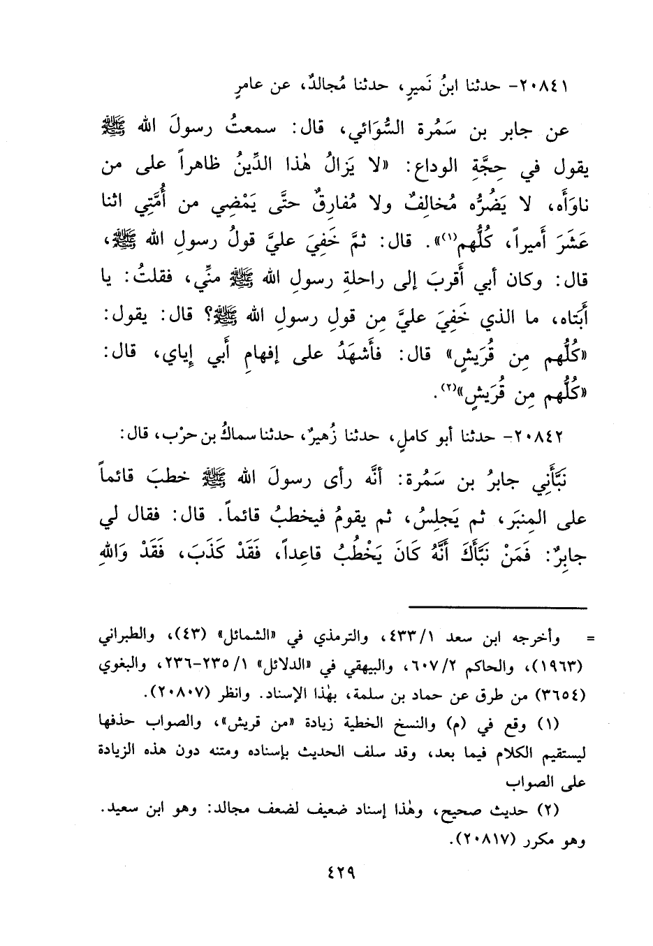 ٢٠٨٤١ - حَدَّثَنَا ابْنُ نُمَيْرٍ، حَدَّثَنَا مُجَالِدٌ، عَنْ عَامِرٍ، عَنْ جَابِرِ بْنِ سَمُرَةَ السُّوَائِيِّ، قَالَ: سَمِعْتُ رَسُولَ اللهِ صَلَّى اللهُ عَلَيْهِ وَسَلَّمَ يَقُولُ فِي حَجَّةِ الْوَدَاعِ: " لَا يَزَالُ هَذَا الدِّينُ ظَاهِرًا عَلَى مَنْ نَاوَأَهُ، لَا يَضُرُّهُ مُخَالِفٌ، وَلَا مُفَارِقٌ، حَتَّى يَمْضِيَ مِنْ أُمَّتِي اثْنَا عَشَرَ أَمِيرًا، كُلُّهُمْ " (١) قَالَ: ثُمَّ خَفِيَ عَلَيَّ قَوْلُ رَسُولِ اللهِ صَلَّى اللهُ عَلَيْهِ وَسَلَّمَ قَالَ: وَكَانَ أَبِي أَقْرَبَ إِلَى رَاحِلَةِ رَسُولِ اللهِ صَلَّى اللهُ عَلَيْهِ وَسَلَّمَ مِنِّي، فَقُلْتُ: يَا أَبَتَاهُ مَا الَّذِي خَفِيَ عَلَيَّ مِنْ قَوْلِ رَسُولِ اللهِ صَلَّى اللهُ عَلَيْهِ وَسَلَّمَ قَالَ: يَقُولُ: " كُلُّهُمْ مِنْ قُرَيْشٍ "، قَالَ: فَأَشْهَدُ عَلَى إِفْهَامِ أَبِي إِيَّايَ، قَالَ: " كُلُّهُمْ مِنْ قُرَيْشٍ " (٢)