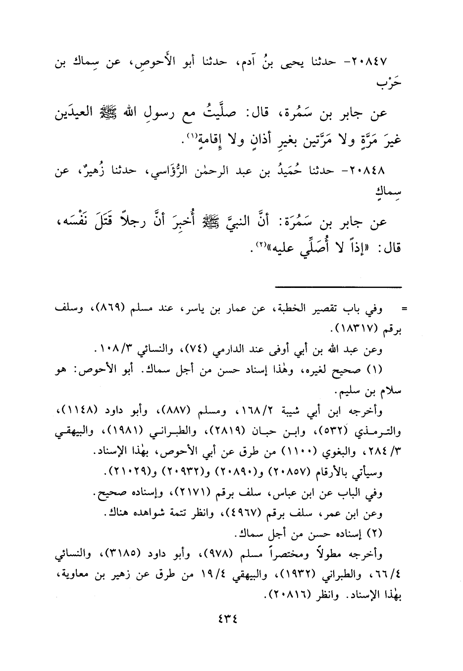 ٢٠٨٤٧ - حَدَّثَنَا يَحْيَى بْنُ آدَمَ، حَدَّثَنَا أَبُو الْأَحْوَصِ، عَنْ سِمَاكِ بْنِ حَرْبٍ، عَنْ جَابِرِ بْنِ سَمُرَةَ، قَالَ: " صَلَّيْتُ مَعَ رَسُولِ اللهِ صَلَّى اللهُ عَلَيْهِ وَسَلَّمَ الْعِيدَيْنِ غَيْرَ مَرَّةٍ، وَلَا مَرَّتَيْنِ، بِغَيْرِ أَذَانٍ وَلَا إِقَامَةٍ " (١)