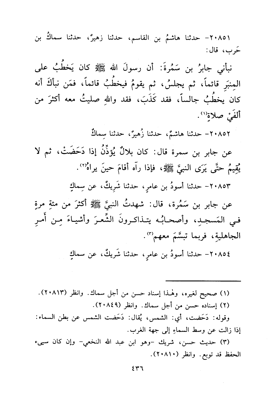 ٢٠٨٥١ - حَدَّثَنَا هَاشِمُ بْنُ الْقَاسِمِ، حَدَّثَنَا زُهَيْرٌ، حَدَّثَنَا سِمَاكُ بْنُ حَرْبٍ، قَالَ: نَبَّأَنِي جَابِرُ بْنُ سَمُرَةَ، " أَنَّ رَسُولَ اللهِ صَلَّى اللهُ عَلَيْهِ وَسَلَّمَ كَانَ يَخْطُبُ عَلَى الْمِنْبَرِ قَائِمًا، ثُمَّ يَجْلِسُ، ثُمَّ يَقُومُ فَيَخْطُبُ قَائِمًا، فَمَنْ نَبَّأَكَ أَنَّهُ كَانَ يَخْطُبُ جَالِسًا فَقَدْ كَذَبَ، فَقَدْ وَاللهِ صَلَّيْتُ مَعَهُ أَكْثَرَ مِنْ أَلْفَيْ صَلَاةٍ " (١)