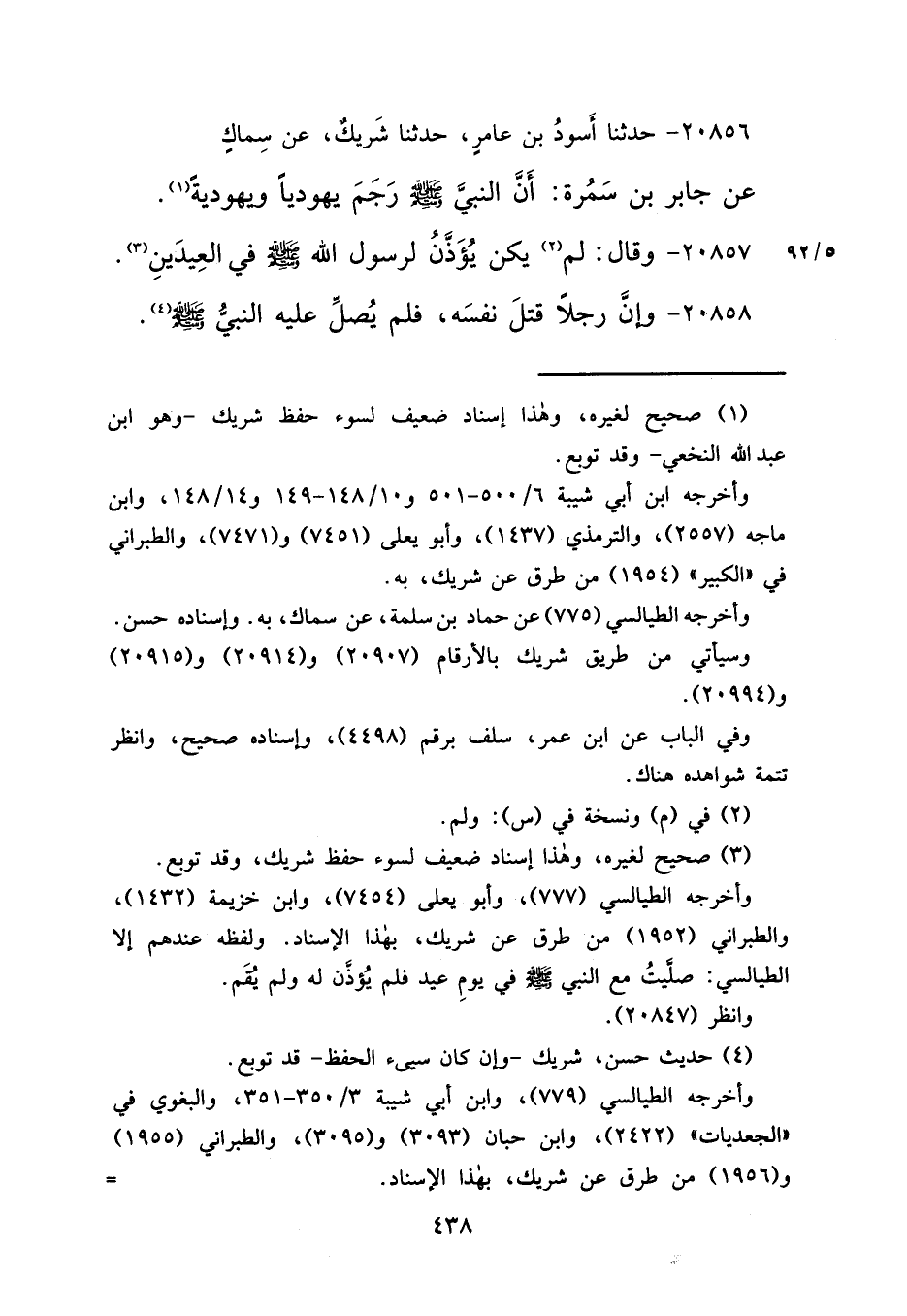 ٢٠٨٥٦ - حَدَّثَنَا أَسْوَدُ بْنُ عَامِرٍ، حَدَّثَنَا شَرِيكٌ، عَنْ سِمَاكٍ، عَنْ جَابِرِ بْنِ سَمُرَةَ، " أَنَّ النَّبِيَّ صَلَّى اللهُ عَلَيْهِ وَسَلَّمَ رَجَمَ يَهُودِيًّا وَيَهُودِيَّةً " (١)