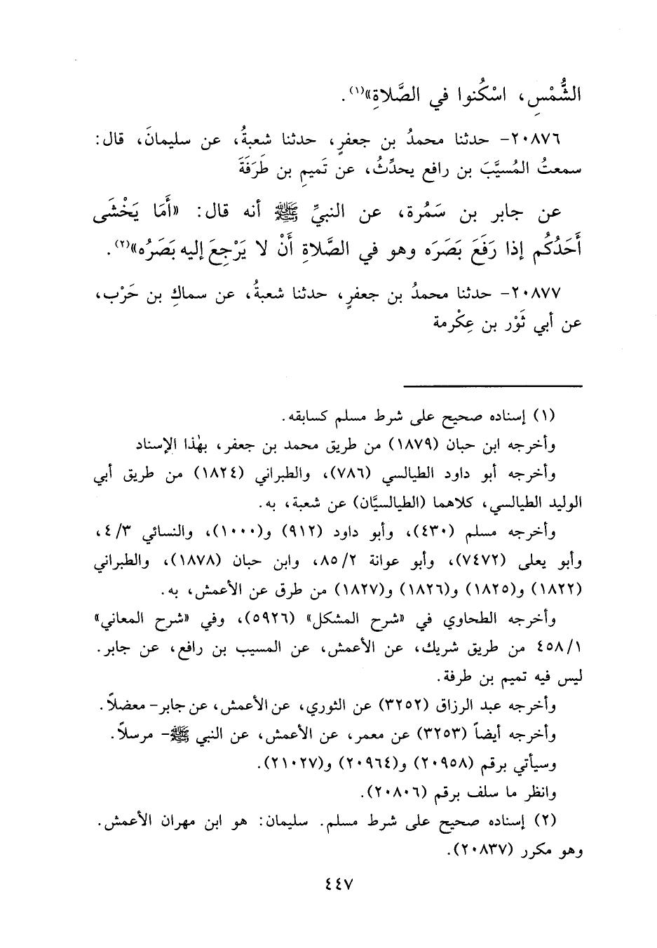 ٢٠٨٧٦ - حَدَّثَنَا مُحَمَّدُ بْنُ جَعْفَرٍ، حَدَّثَنَا شُعْبَةُ، عَنْ سُلَيْمَانَ قَالَ: سَمِعْتُ الْمُسَيَّبَ بْنَ رَافِعٍ، يُحَدِّثُ عَنْ تَمِيمِ بْنِ طَرَفَةَ، عَنْ جَابِرِ بْنِ سَمُرَةَ، عَنِ النَّبِيِّ صَلَّى اللهُ عَلَيْهِ وَسَلَّمَ، أَنَّهُ قَالَ: " أَمَا يَخْشَى أَحَدُكُمْ إِذَا رَفَعَ بَصَرَهُ وَهُوَ فِي الصَّلَاةِ، أَنْ لَا يَرْجِعَ إِلَيْهِ بَصَرُهُ " (٢)