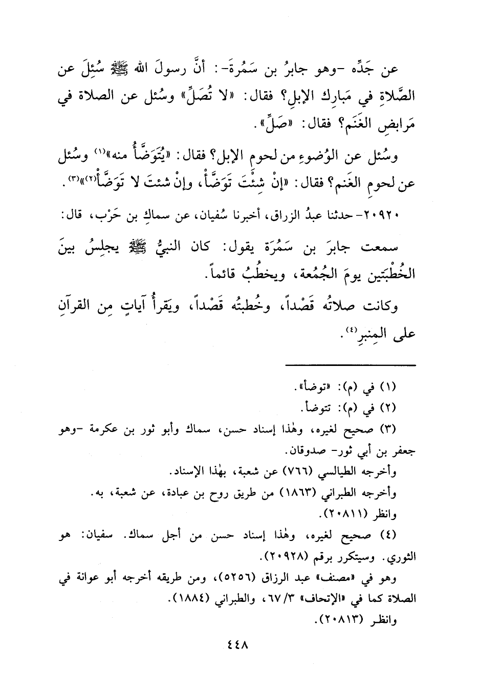 عَنْ جَدِّهِ وَهُوَ جَابِرُ بْنُ سَمُرَةَ، أَنَّ رَسُولَ اللهِ صَلَّى اللهُ عَلَيْهِ وَسَلَّمَ سُئِلَ عَنِ الصَّلَاةِ فِي مَبَارِكِ الْإِبِلِ؟ فَقَالَ: " لَا تُصَلِّ "، وَسُئِلَ عَنِ الصَّلَاةِ فِي مَرَابِضِ الْغَنَمِ؟ فَقَالَ: " صَلِّ "، وَسُئِلَ عَنِ الْوُضُوءِ مِنْ لُحُومِ الْإِبِلِ، فَقَالَ: " يُتَوَضَّأْ مِنْهُ " (١) ، وَسُئِلَ عَنْ لُحُومِ الْغَنَمِ، فَقَالَ: " إِنْ شِئْتَ تَوَضَّأْ، وَإِنْ شِئْتَ لَا تَوَضَّأْ (٢) " (٣)