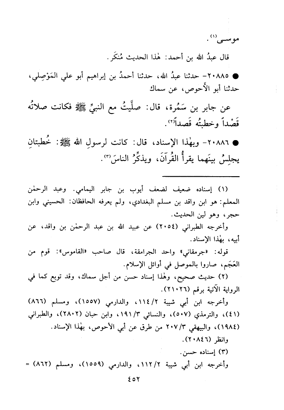 • ٢٠٨٨٥ - حَدَّثَنَا عَبْدُ اللهِ، حَدَّثَنَا أَحْمَدُ بْنُ إِبْرَاهِيمَ أَبُو عَلِيٍّ الْمَوْصِلِيُّ، حَدَّثَنَا أَبُو الْأَحْوَصِ، عَنْ سِمَاكٍ، عَنْ جَابِرِ بْنِ سَمُرَةَ، قَالَ: " صَلَّيْتُ مَعَ النَّبِيِّ صَلَّى اللهُ عَلَيْهِ وَسَلَّمَ، فَكَانَتْ صَلَاتُهُ قَصْدًا، وَخُطْبَتُهُ قَصْدًا " (٢)