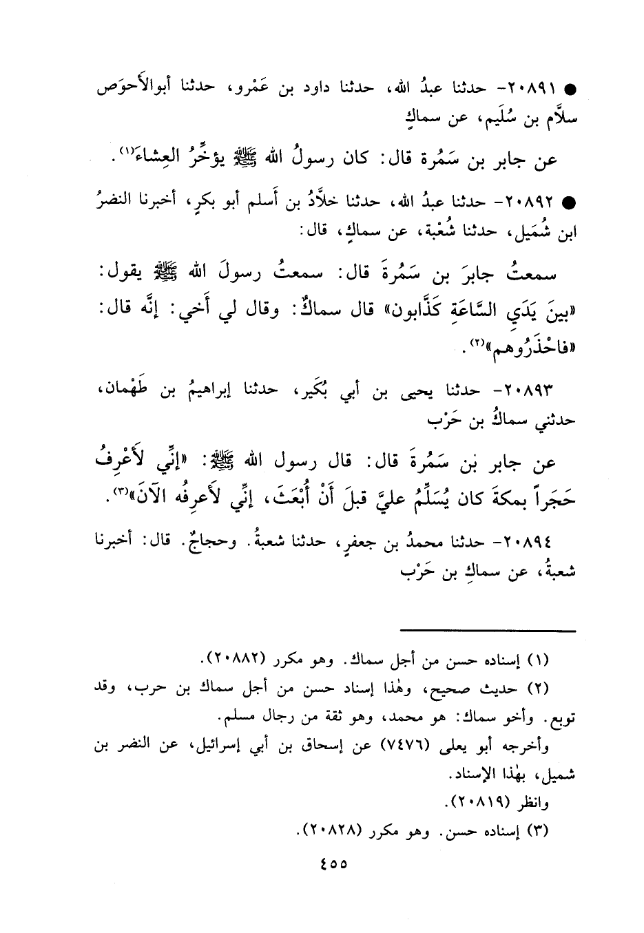 • ٢٠٨٩٢ - حَدَّثَنَا عَبْدُ اللهِ، حَدَّثَنَا خَلَّادُ بْنُ أَسْلَمَ أَبُو بَكْرٍ، أَخْبَرَنَا النَّضْرُ بْنُ شُمَيْلٍ، حَدَّثَنَا شُعْبَةُ، عَنْ سِمَاكٍ، قَالَ: سَمِعْتُ جَابِرَ بْنَ سَمُرَةَ، قَالَ: سَمِعْتُ رَسُولَ اللهِ صَلَّى اللهُ عَلَيْهِ وَسَلَّمَ، يَقُولُ: " بَيْنَ يَدَيِ السَّاعَةِ كَذَّابُونَ "، قَالَ سِمَاكٌ، وَقَالَ لِي أَخِي: إِنَّهُ قَالَ: " فَاحْذَرُوهُمْ " (٢)