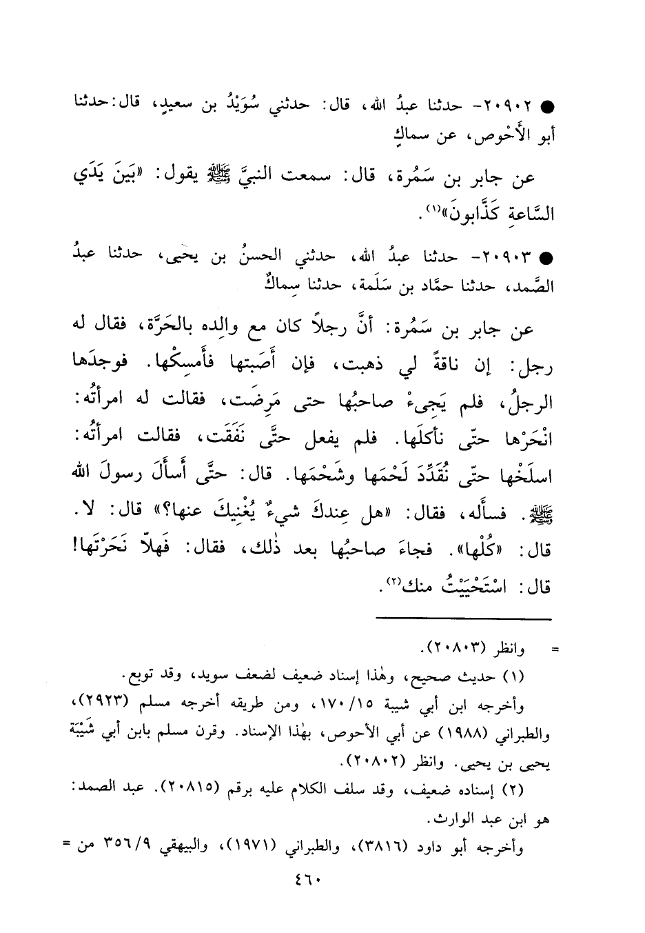 • ٢٠٩٠٢ - حَدَّثَنَا عَبْدُ اللهِ، قَالَ: حَدَّثَنِي سُوَيْدُ بْنُ سَعِيدٍ، قَالَ: حَدَّثَنَا أَبُو الْأَحْوَصِ، عَنْ سِمَاكٍ، عَنْ جَابِرِ بْنِ سَمُرَةَ، قَالَ: سَمِعْتُ النَّبِيَّ صَلَّى اللهُ عَلَيْهِ وَسَلَّمَ يَقُولُ: " بَيْنَ يَدَيِ السَّاعَةِ كَذَّابُونَ " (١)
