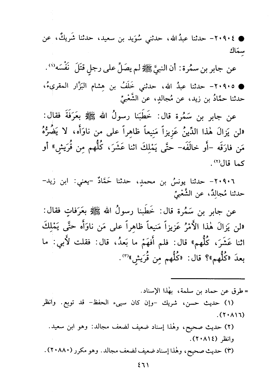 • ٢٠٩٠٥ - حَدَّثَنَا عَبْدُ اللهِ، حَدَّثَنِي خَلَفُ بْنُ هِشَامٍ الْبَزَّارُ الْمُقْرِئُ، حَدَّثَنَا حَمَّادُ بْنُ زَيْدٍ، عَنْ مُجَالِدٍ، عَنْ الشَّعْبِيِّ، عَنْ جَابِرِ بْنِ سَمُرَةَ، قَالَ: خَطَبَنَا رَسُولُ اللهِ صَلَّى اللهُ عَلَيْهِ وَسَلَّمَ بِعَرَفَةَ، فَقَالَ: " لَنْ يَزَالَ هَذَا الدِّينُ عَزِيزًا مَنِيعًا ظَاهِرًا عَلَى مَنْ نَاوَأَهُ، لَا يَضُرُّهُ مَنْ فَارَقَهُ، أَوْ خَالَفَهُ، حَتَّى يَمْلِكَ اثْنَا عَشَرَ كُلُّهُمْ مِنْ قُرَيْشٍ "، أَوْ كَمَا قَالَ (٢)