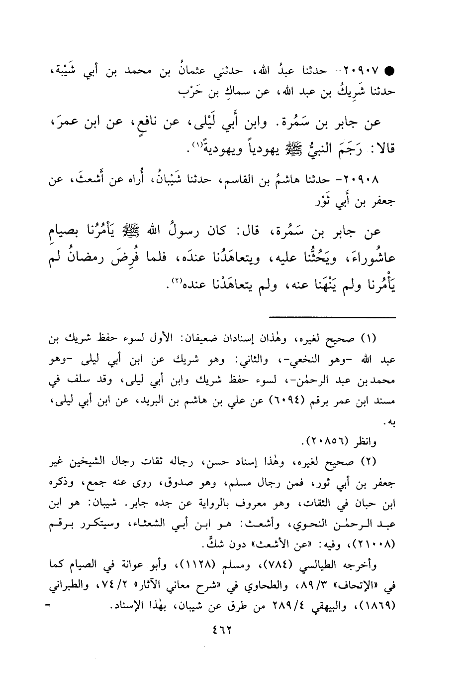 • ٢٠٩٠٧ - حَدَّثَنَا عَبْدُ اللهِ، حَدَّثَنِي عُثْمَانُ بْنُ مُحَمَّدِ بْنِ أَبِي شَيْبَةَ، حَدَّثَنَا شَرِيكُ بْنُ عَبْدِ اللهِ، عَنْ سِمَاكِ بْنِ حَرْبٍ، عَنْ جَابِرِ بْنِ سَمُرَةَ، وَابْنِ أَبِي لَيْلَى، عَنِ نَافِعٍ، عَنْ ابْنِ عُمَرَ، قَالَا: " رَجَمَ النَّبِيُّ صَلَّى اللهُ عَلَيْهِ وَسَلَّمَ يَهُودِيًّا وَيَهُودِيَّةً " (١)
