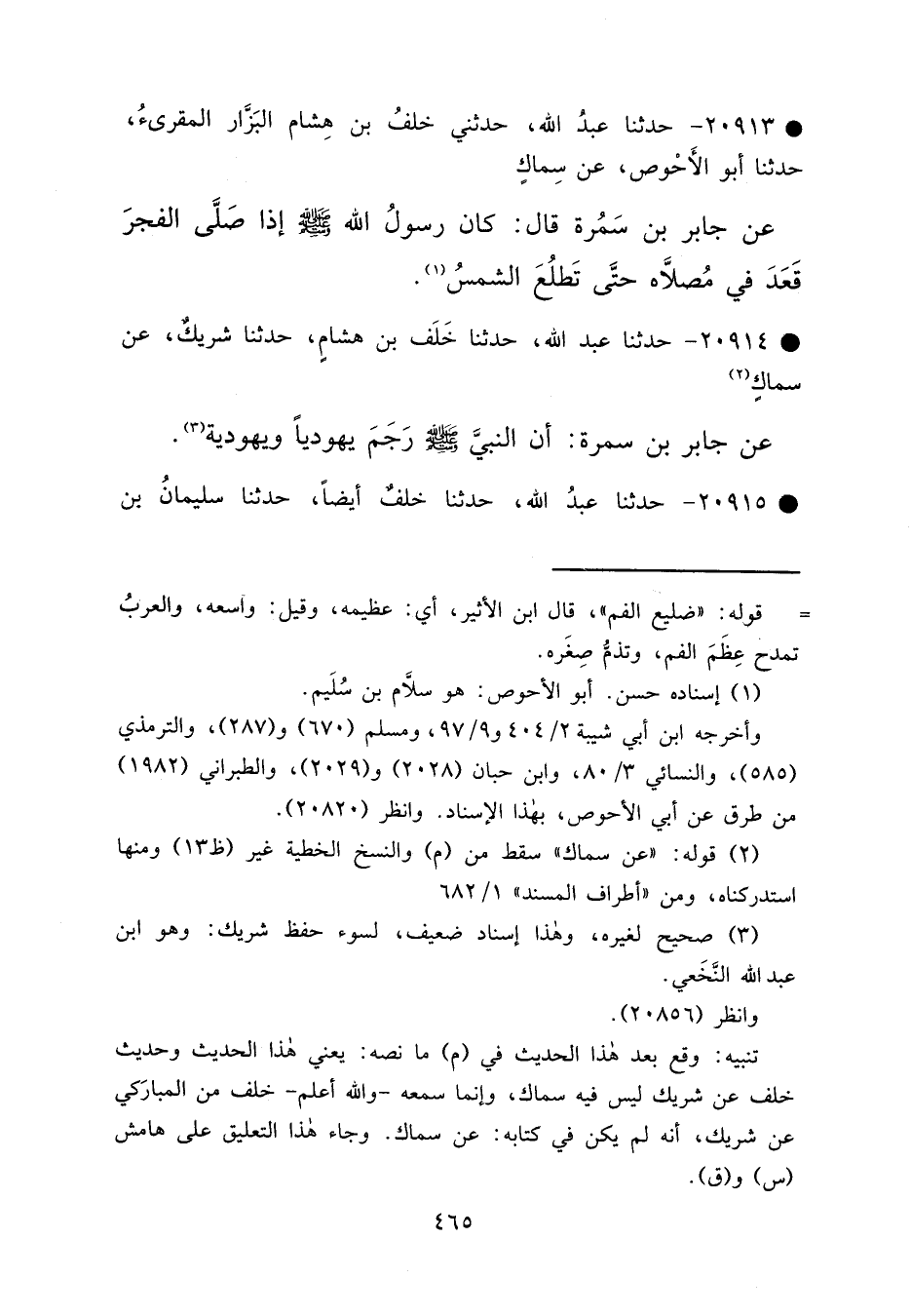 • ٢٠٩١٣ - حَدَّثَنَا عَبْدُ اللهِ، حَدَّثَنِي خَلَفُ بْنُ هِشَامٍ الْبَزَّارُ الْمُقْرِئُ، حَدَّثَنَا أَبُو الْأَحْوَصِ، عَنْ سِمَاكٍ، عَنْ جَابِرِ بْنِ سَمُرَةَ، قَالَ: " كَانَ رَسُولُ اللهِ صَلَّى اللهُ عَلَيْهِ وَسَلَّمَ إِذَا صَلَّى الْفَجْرَ قَعَدَ فِي مُصَلَّاهُ حَتَّى تَطْلُعَ الشَّمْسُ " (١)
