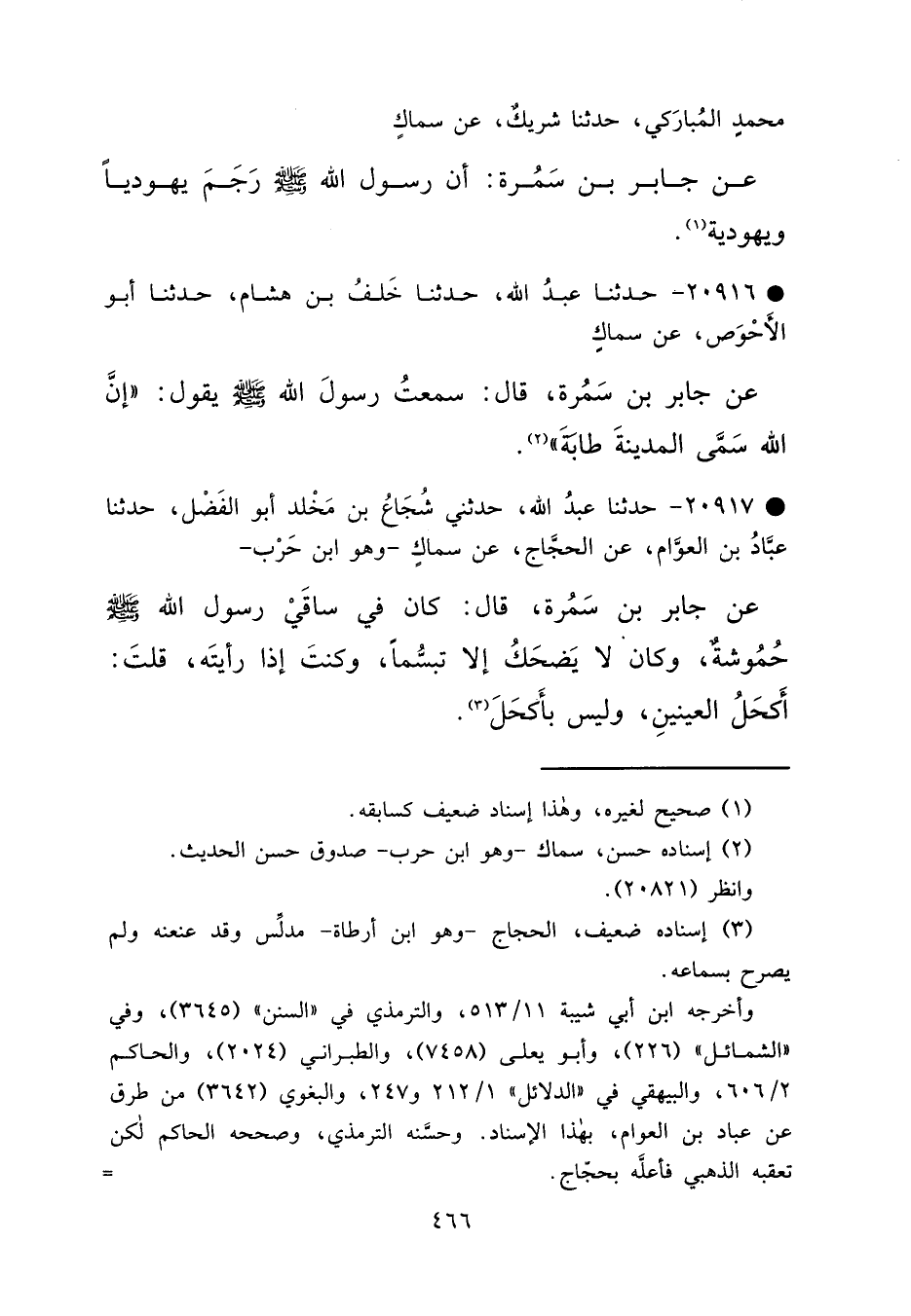 • ٢٠٩١٧ - حَدَّثَنَا عَبْدُ اللهِ، حَدَّثَنِي شُجَاعُ بْنُ مَخْلَدٍ أَبُو الْفَضْلِ، حَدَّثَنَا عَبَّادُ بْنُ الْعَوَّامِ، عَنِ الْحَجَّاجِ، عَنْ سِمَاكٍ وَهُوَ ابْنُ حَرْبٍ، عَنْ جَابِرِ بْنِ سَمُرَةَ، قَالَ: " كَانَ فِي سَاقَيْ رَسُولِ اللهِ صَلَّى اللهُ عَلَيْهِ وَسَلَّمَ حُمُوشَةٌ، وَكَانَ لَا يَضْحَكُ إِلَّا تَبَسُّمًا، وَكُنْتُ إِذَا رَأَيْتُهُ قُلْتُ: أَكْحَلُ الْعَيْنَيْنِ، وَلَيْسَ بِأَكْحَلَ " (٣)