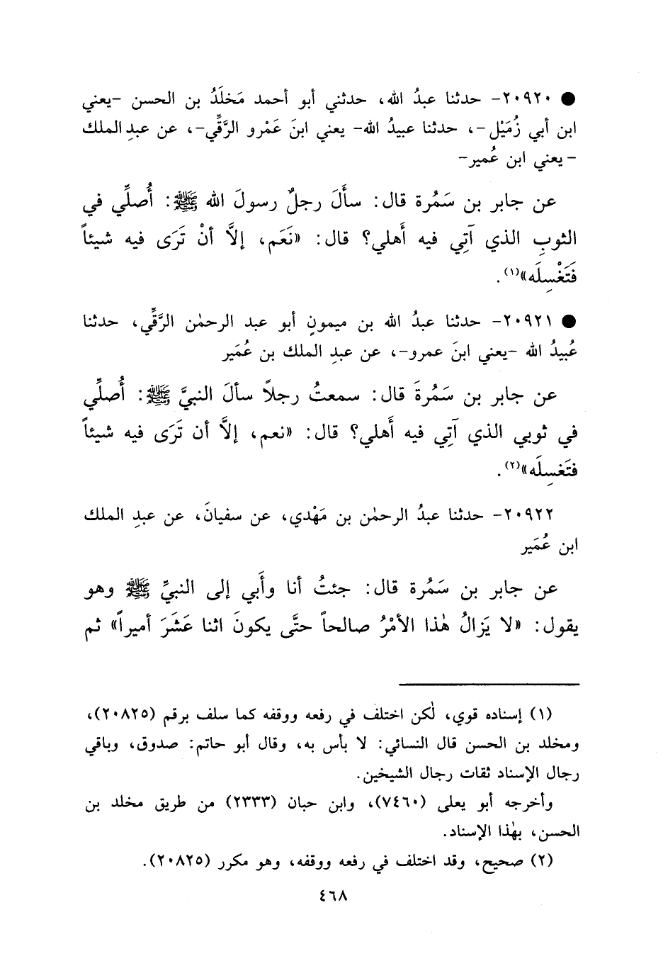 • ٢٠٩٢٠ - حَدَّثَنَا عَبْدُ اللهِ، حَدَّثَنِي أَبُو أَحْمَدَ مَخْلَدُ بْنُ الْحَسَنِ يَعْنِي ابْنَ أَبِي زُمَيْلٍ، حَدَّثَنَا عُبَيْدُ اللهِ يَعْنِي ابْنَ عَمْرٍو الرَّقِّيَّ، عَنْ عَبْدِ الْمَلِكِ يَعْنِي ابْنَ عُمَيْرٍ، عَنْ جَابِرِ بْنِ سَمُرَةَ، قَالَ: سَأَلَ رَجُلٌ رَسُولَ اللهِ صَلَّى اللهُ عَلَيْهِ وَسَلَّمَ، أُصَلِّي فِي الثَّوْبِ الَّذِي آتِي فِيهِ أَهْلِي؟ قَالَ: " نَعَمْ، إِلَّا أَنْ تَرَى فِيهِ شَيْئًا فَتَغْسِلَهُ " (١)