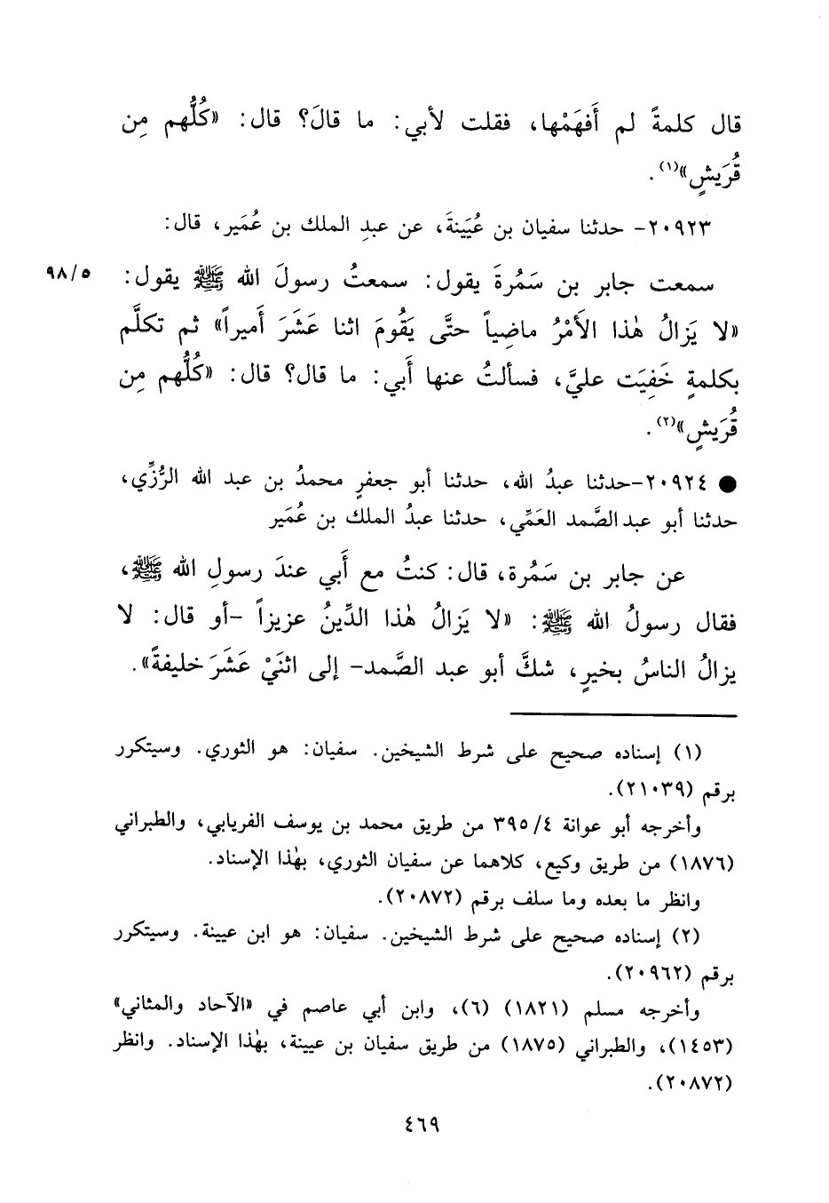 ٢٠٩٢٣ - حَدَّثَنَا سُفْيَانُ بْنُ عُيَيْنَةَ، عَنْ عَبْدِ الْمَلِكِ بْنِ عُمَيْرٍ، قَالَ: سَمِعْتُ جَابِرَ بْنَ سَمُرَةَ، يَقُولُ: سَمِعْتُ رَسُولَ اللهِ صَلَّى اللهُ عَلَيْهِ وَسَلَّمَ يَقُولُ: " لَا يَزَالُ هَذَا الْأَمْرُ مَاضِيًا حَتَّى يَقُومَ اثْنَا عَشَرَ أَمِيرًا "، ثُمَّ تَكَلَّمَ بِكَلِمَةٍ خَفِيَتْ عَلَيَّ، فَسَأَلْتُ عَنْهَا أَبِي، مَا قَالَ؟ قَالَ: " كُلُّهُمْ مِنْ قُرَيْشٍ " (٢)